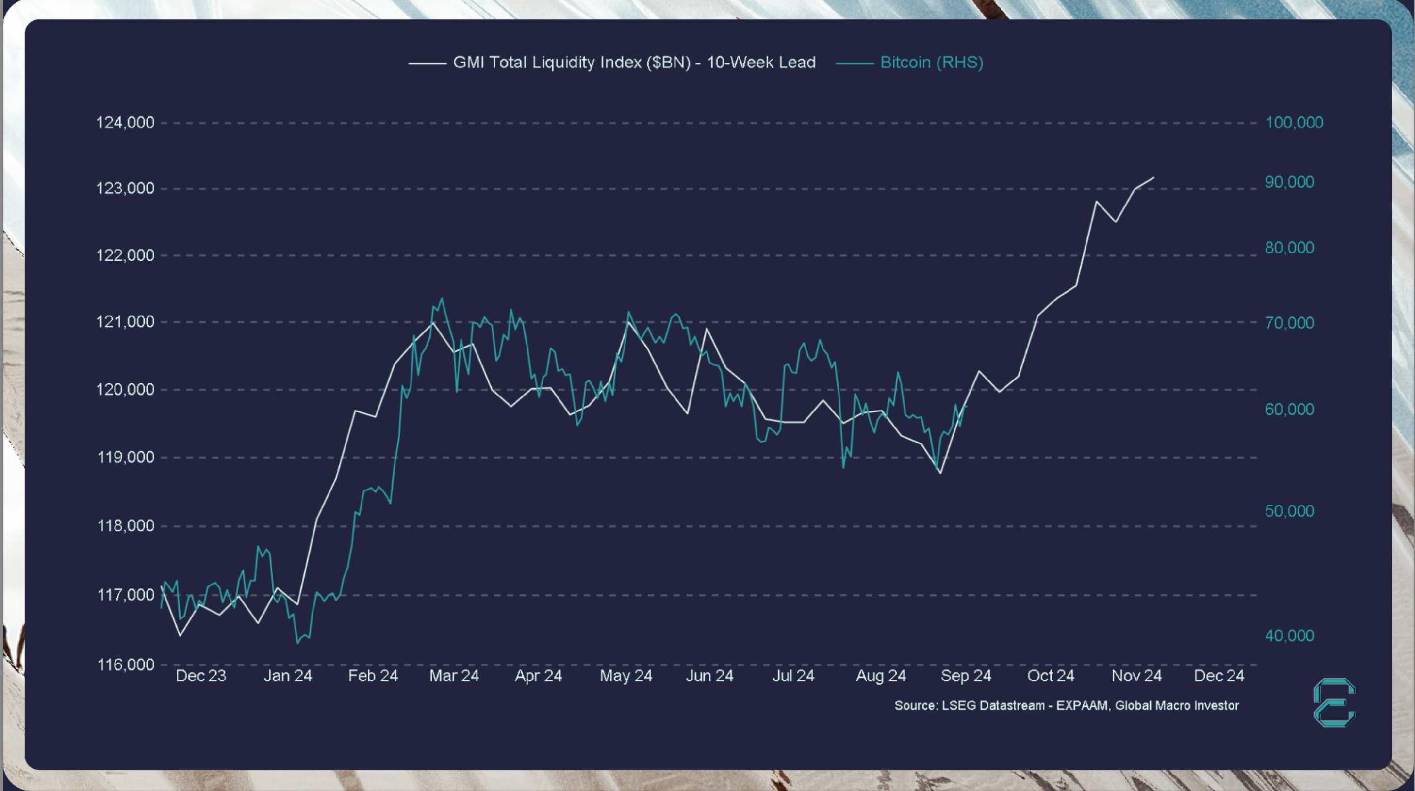 - Bitcoin moves in the direction of global liquidity 83% of the time in any given 12-month period, which is higher than any other major asset class, making it a strong barometer of liquidity conditions.