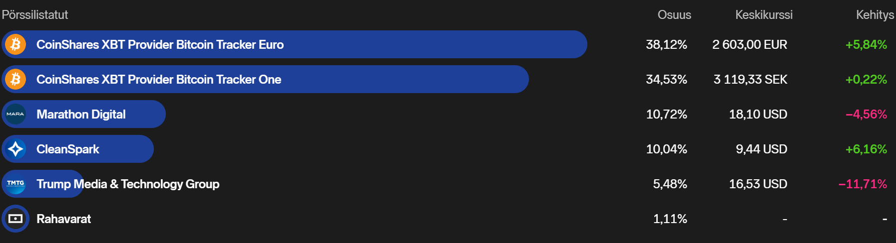 Oma salkkukin on kääntynyt melkein täysin bitcoin ym. vastaavat linjalle. Tulee aina vaan mietittyä että mikä ihmeen Kesko tai Nordea voi tulevaisuudessa tuoda semmoisia tuottoja kuin Kryptot ja niihin liittyvä touhu. Tullu jo varmaan Kryptolasit itselle ![]()