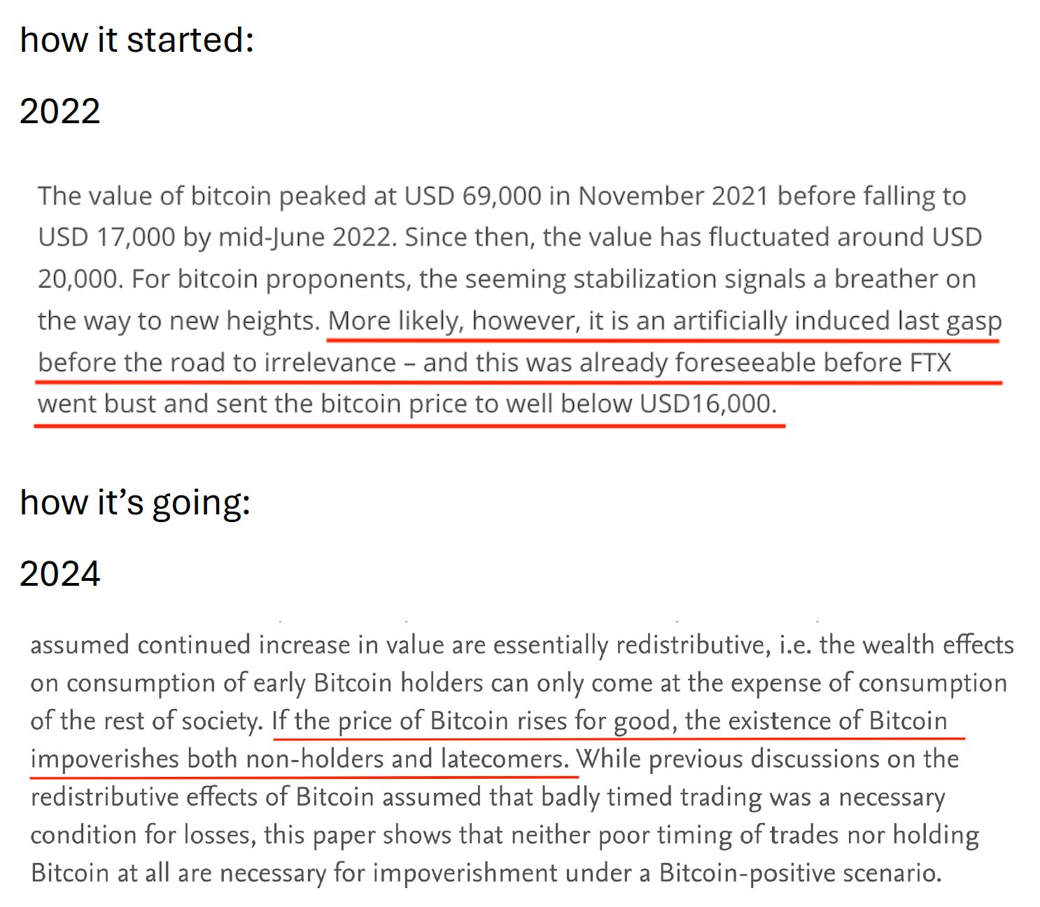 Näistä tuo 2. tuo minulle mieleen tuon EKP paperin. Kummassakin todetaan, että riippumatta siitä osallistutko suoraan bitcoin talouteen, tarpeaksi merkittävä bitcoin voi tuoda sinulle hyvinvointitappioita jos et ole early adoptor jota määritelmällisesti suurin osa ei voi olla.