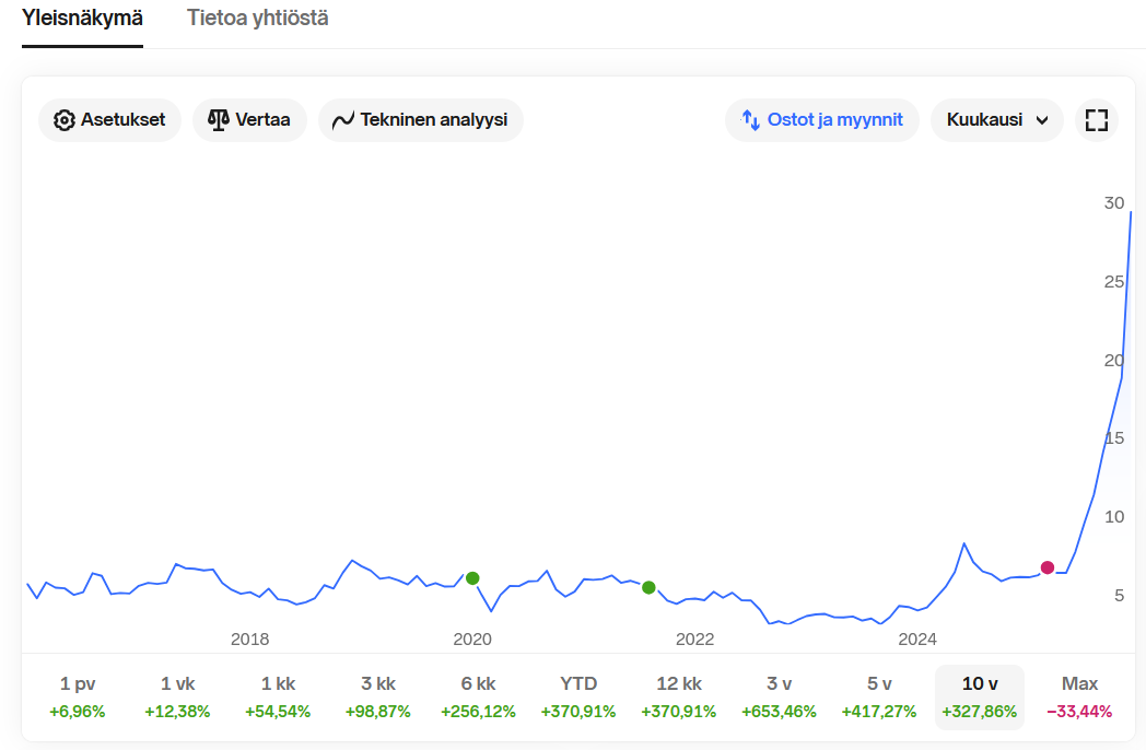 Bittium er en finsk teknologivirksomhed, der har specialiseret sig i løsninger til sikker kommunikation og konnektivitet inden for forsvar, offentlig sikkerhed, kritisk infrastruktur og medicinske applikationer. I den nuværende cyklus er Bittiums omsætning vokset fra 82,5 MEUR i 2022, hvor driftsresultatet var tæt på nul og ordrebeholdningen ca. 28 MEUR, til 85,2 MEUR i 2024, hvor ordrebeholdningen var 45 MEUR og driftsresultatet 8,6 MEUR, svarende til en rentabilitet på 10,1 %. Bittium har netop opnået et gennembrud i Spanien i samarbejde med Indra og har hævet sine forventninger (guidance) for 2025 til en omsætning på 116–120 MEUR og et driftsresultat på 19–21 MEUR. Dette inkluderer en lille del af teknologioverførselsaftalen med Indra, men den underliggende resultatudvikling er også på en fremragende kurs.