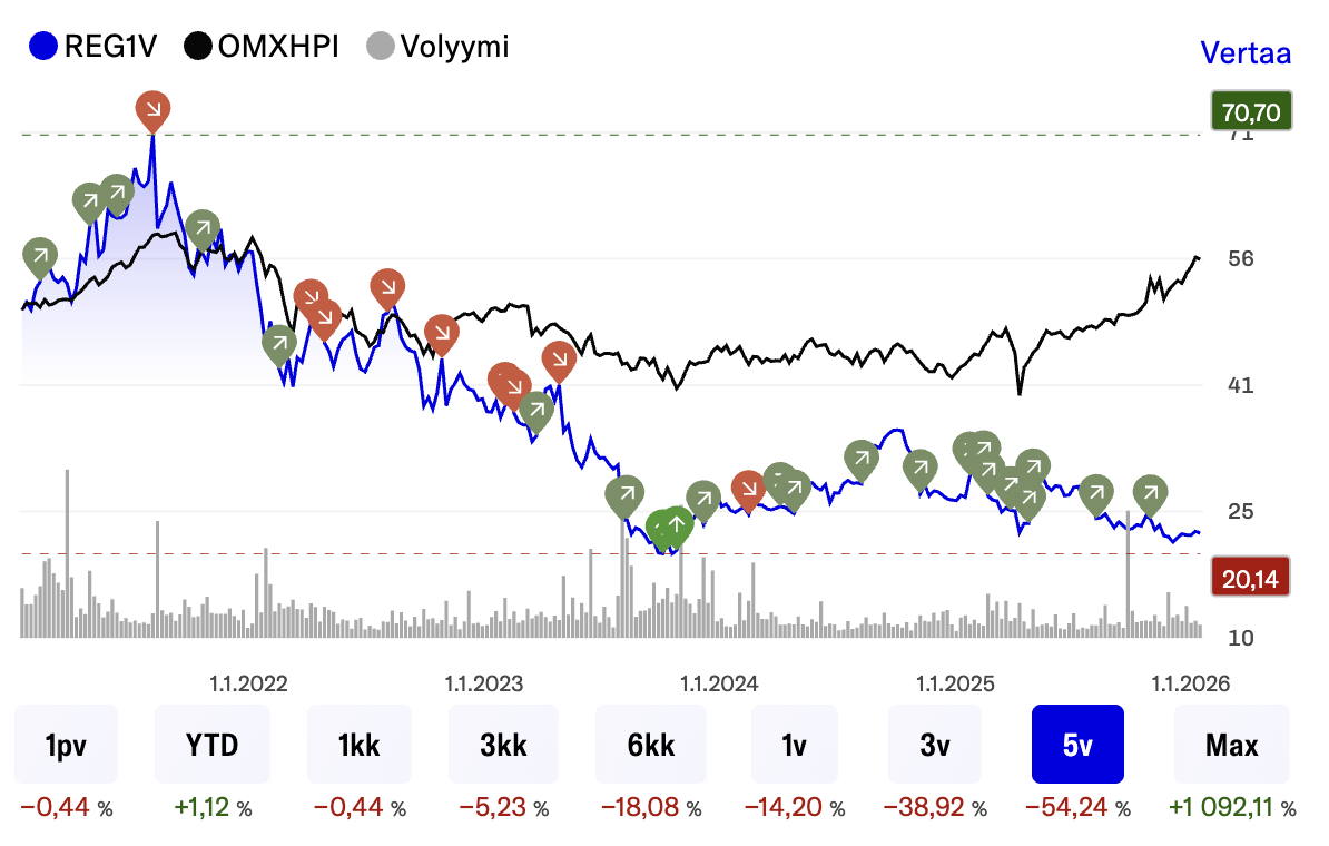 Vaikkei tämä Bittium-ketjuun kuulu, niin alla Revenion käyrää viideltä vuodelta.