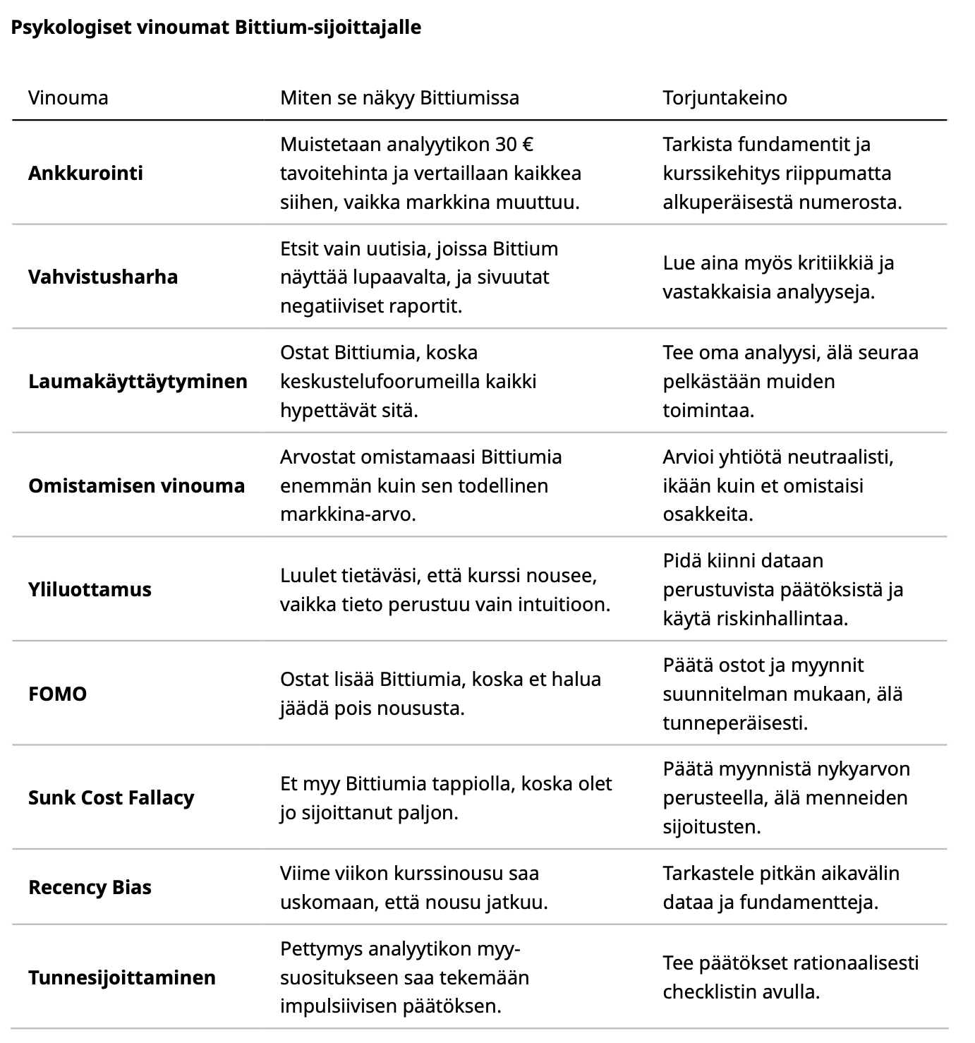 Är det verkligen värt att ta så illa vid sig av analytikernas rekommendationer. De är bara en aktör bland tusentals. Som om en enskild person skulle avgöra ett företags verkliga värde och inte företagets affärsverksamhet. Det som skulle oroa mig mer om jag vore ägare är vad som händer när bolaget faktiskt drabbas av riktigt dåliga nyheter (vilket oundvikligen kan hända företag förr eller senare. Jämför t.ex. tillväxtbolag som Revenio, QT, Talenom osv.). Med den här ägarskaran blir det ingen vacker syn om till exempel 2026 års guidance missar förväntningarna med minsta lilla. Intressant hur våra beslut förändrar vårt tänkande och att man liksom inte tål motstridiga åsikter. Bittium-ägarnas tänkesätt är enbart förankrat i aktiekursen, som förstås hela tiden måste stiga. Goda förutsättningar för att en bubbla ska uppstå, åtminstone. Om ens egen syn är att aktien är uppenbart billig kan man utnyttja situationen och köpa mer. För många har dock de rationella argumenten för en fortsatt uppgång redan tagit slut.