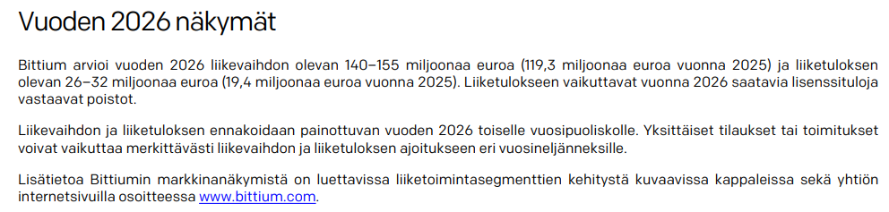 Bittium guidar för en omsättning på 140–155 MEUR och ett rörelseresultat på 26–32 MEUR för år 2026. Enligt bolaget påverkas rörelseresultatet år 2026 av avskrivningar motsvarande de licensintäkter som erhålls. Dessutom meddelade bolaget att omsättningen och rörelseresultatet förväntas vara tyngdpunktslagda till det andra halvåret 2026. Orderstocken vid årets slut var 77,9 MEUR (2024: 45,1 MEUR), medan orderingången under kvartalet steg till hela 97,9 MEUR. Utvecklingen drevs, utöver Indra, av order från Finlands försvarsmakt och Österrike.