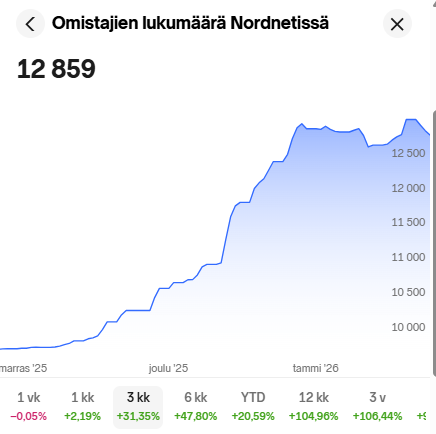 At some point, large sellers appeared in January. The largest were apparently Jtel Oy (â224,519 in January), Aktia fund (â150,000), and Varma (â130,000). Thatâs when the needs of even a larger buyer start to be satisfied. Private investors seem to have stopped buying and have lightened their positions as sentiment has soured along with the share price. So there hasnât been buying pressure from there either, but nothing points to an actual collapse. Looking at the change in sentiment, Iâm even a little surprised that the number of owners on Nordnet hasnât decreasedâa threat or an opportunity for the coming weeks?