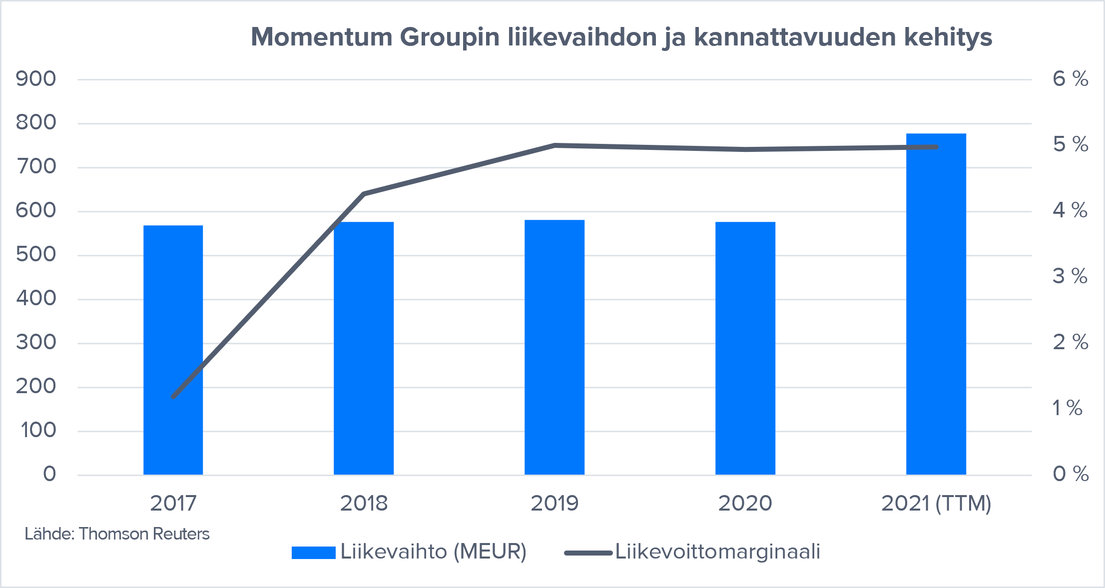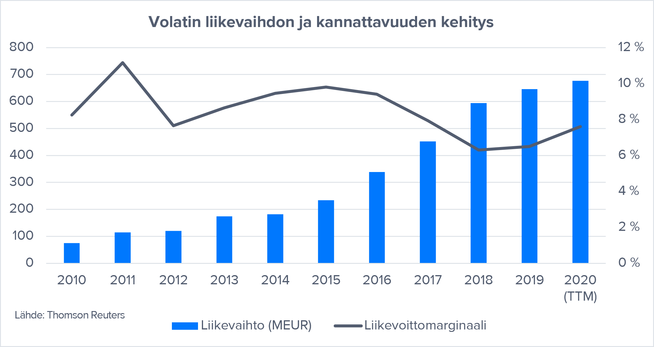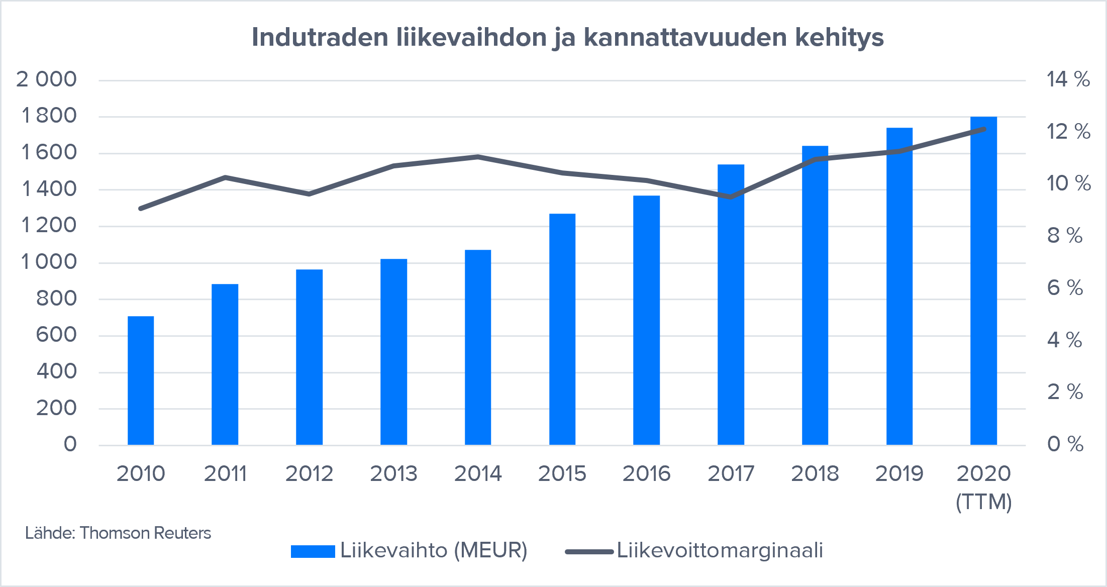 Indutraden taloudellisina tavoitteina on yli 10 % liikevaihdon kasvu, vähintään 12 % EBITA-marginaali sekä yli 20 % sijoitetun pääoman tuotto yli syklin katsottuna. Indutraden kokoluokka ja liiketoimintojen luonteets sekä orgaaniset kasvukuvat huomioiden on selvää, että kasvutavoitteen täyttämiseksi yritysjärjestelyjä on tehtävä vuositasolla useita. Historiallisesti tässä onkin onnistuttu ja vuosina 2010-2020 (TTM) kasvurima on ylitetty. Alla olevassa kuvaajassa Indutraden kannattavuutta on tarkisteltu liikevoittomarginaalilla, mutta kun huomioidaan historiallisesti noin 2 % tasolla olleet PPA-poistot, niin voidaan myös kannattavuustavoite todeta täyttyneeksi.
