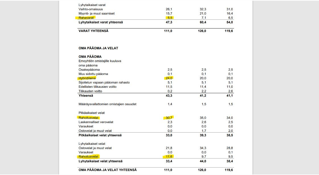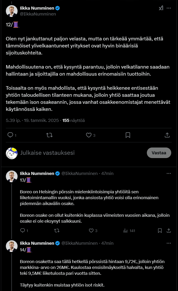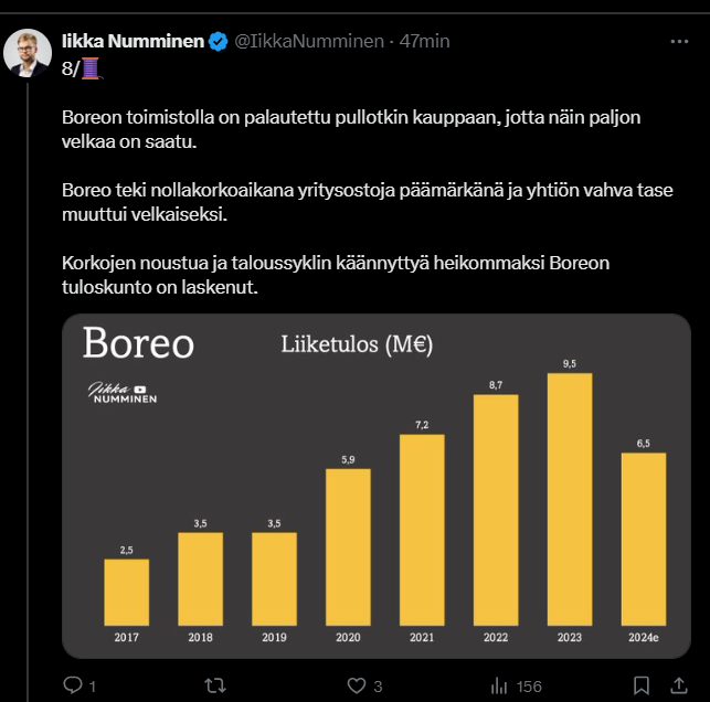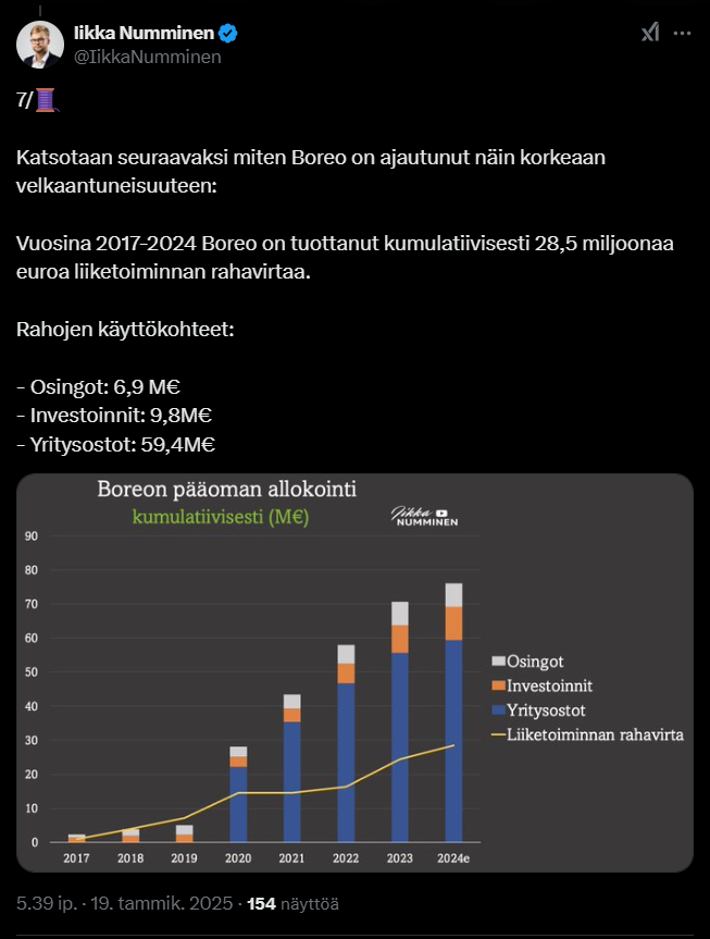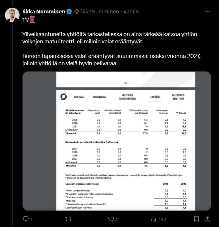Kassassa Boreolla oli Q3-lopussa 5,5 MEUR ja iso osa korollisesta velasta erääntyy 2027, jolloin myös tämä tuoreempi 20 MEUR:n hybridi erääntyy. Ensi vuoden alussa on ekan hybridin jäljellä olevan 4 MEUR:n tarkistuspäivä, jolloin korko nousee jos sitä ei makseta pois. Pakkohan sitä ei ole maksaa, joten siinä on kassan hallinnan näkökulmasta pelivaraa. Mutta likviditeetin ei pitäisi muodostua ongelmaksi ja velkojen erääntymiseen on vielä hyvän matkaa.