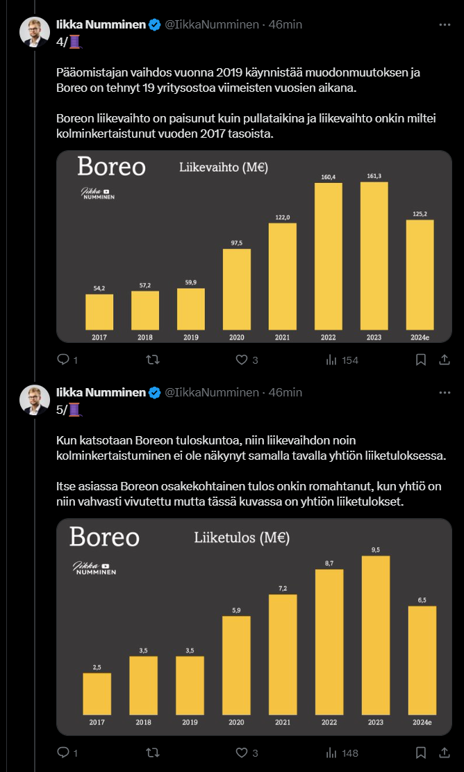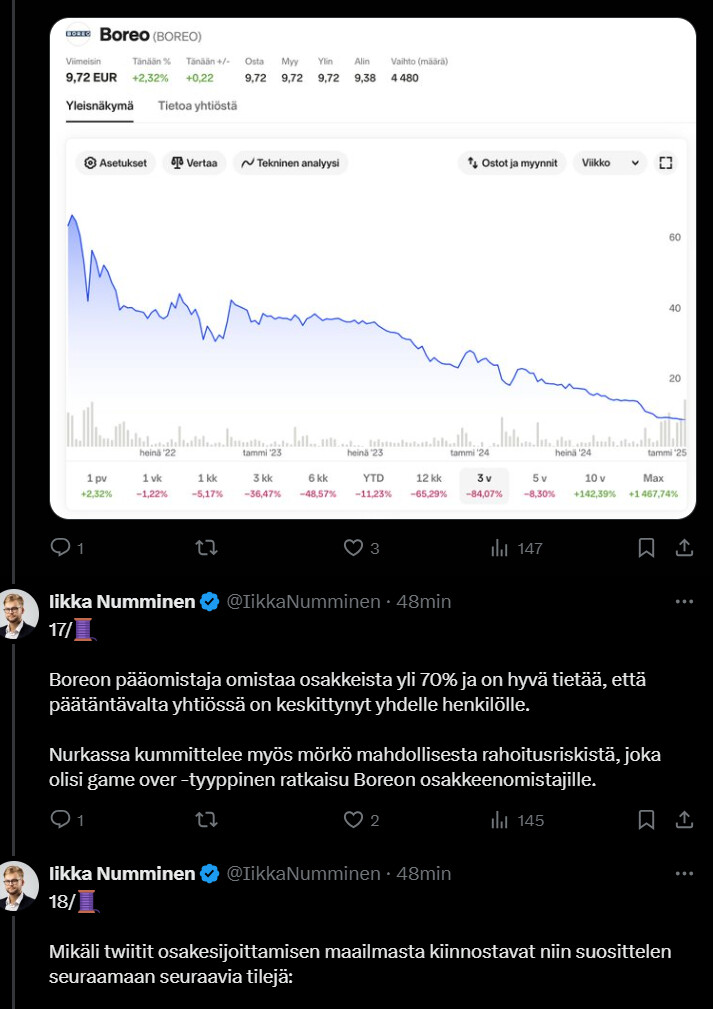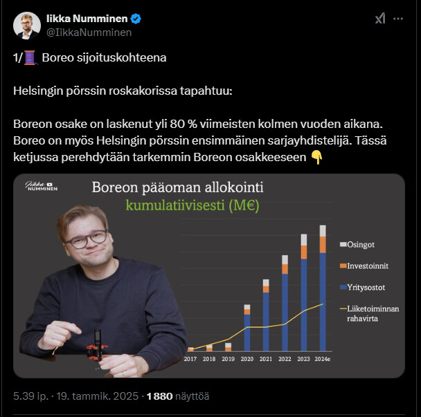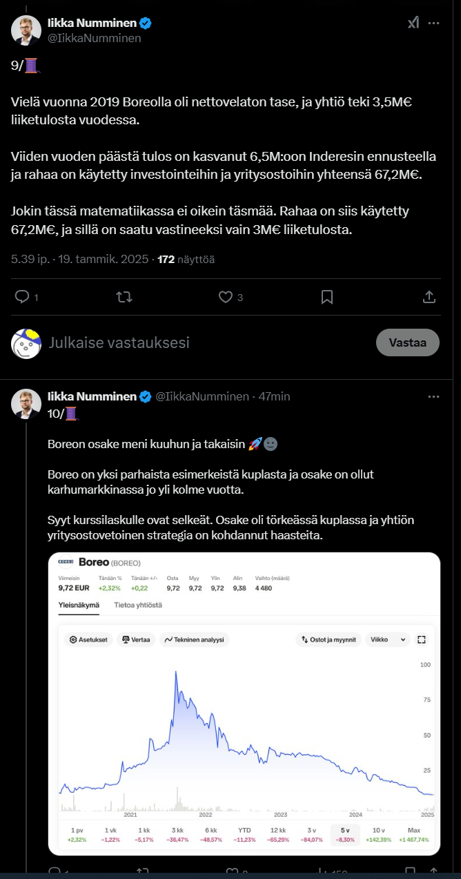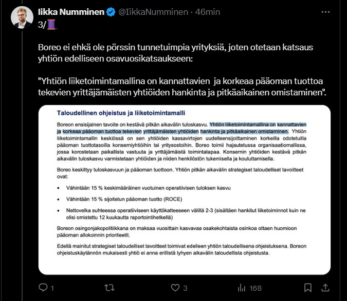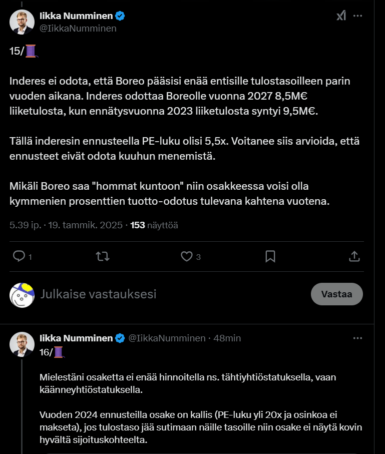 Kassassa Boreolla oli Q3-lopussa 5,5 MEUR ja iso osa korollisesta velasta erääntyy 2027, jolloin myös tämä tuoreempi 20 MEUR:n hybridi erääntyy. Ensi vuoden alussa on ekan hybridin jäljellä olevan 4 MEUR:n tarkistuspäivä, jolloin korko nousee jos sitä ei makseta pois. Pakkohan sitä ei ole maksaa, joten siinä on kassan hallinnan näkökulmasta pelivaraa. Mutta likviditeetin ei pitäisi muodostua ongelmaksi ja velkojen erääntymiseen on vielä hyvän matkaa.
