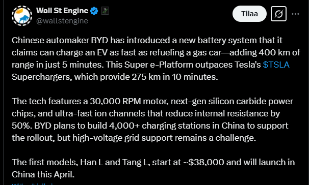 Tämä “uutuus” nosti yhtiön osakekurssia ja se haastaa kilpailijat kuten erityisesti Teslan, lisäksi BYD aikoo rakentaa laajan pikalatausverkoston Kiinaan.