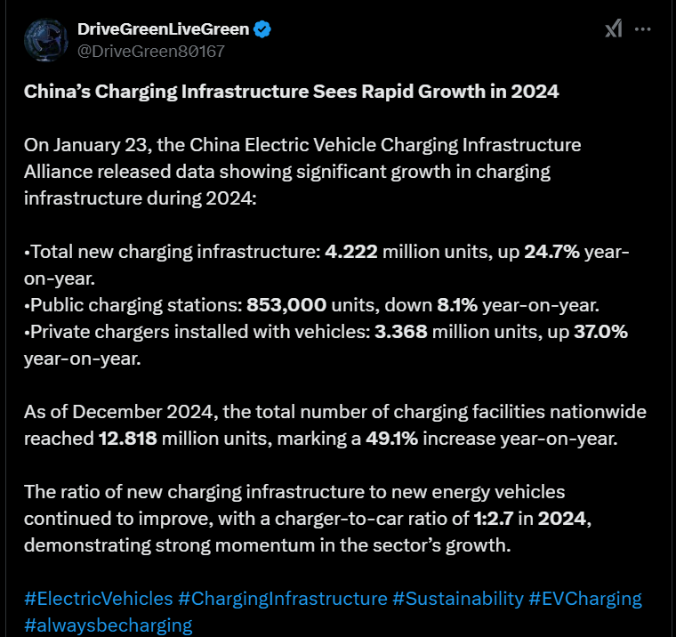 Sopii ehkä tänne BYDinkin ketjuun tämä viesti, että miten Kiinan latausinfrastruktuuri kasvoi nopeasti vuonna 2024.