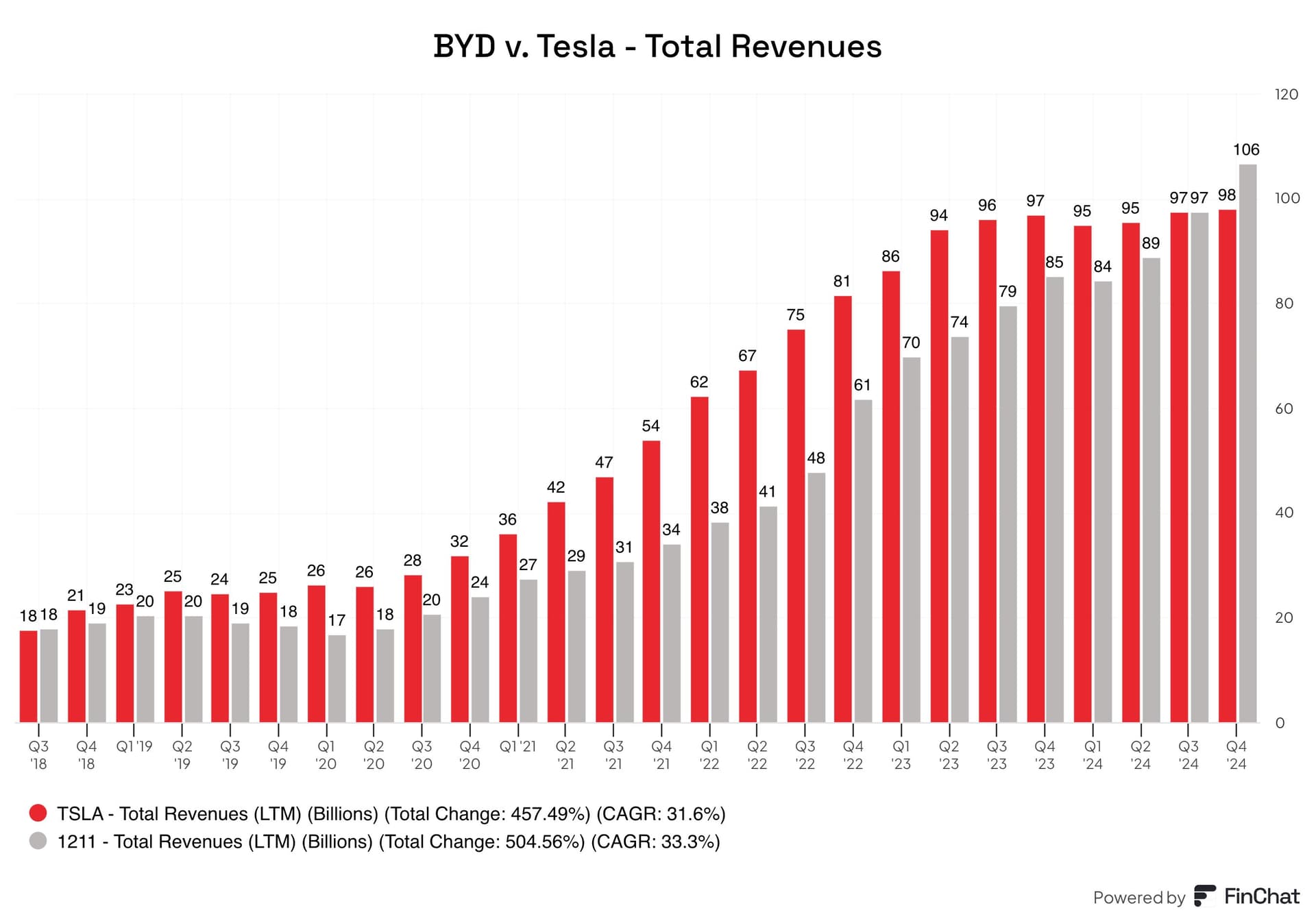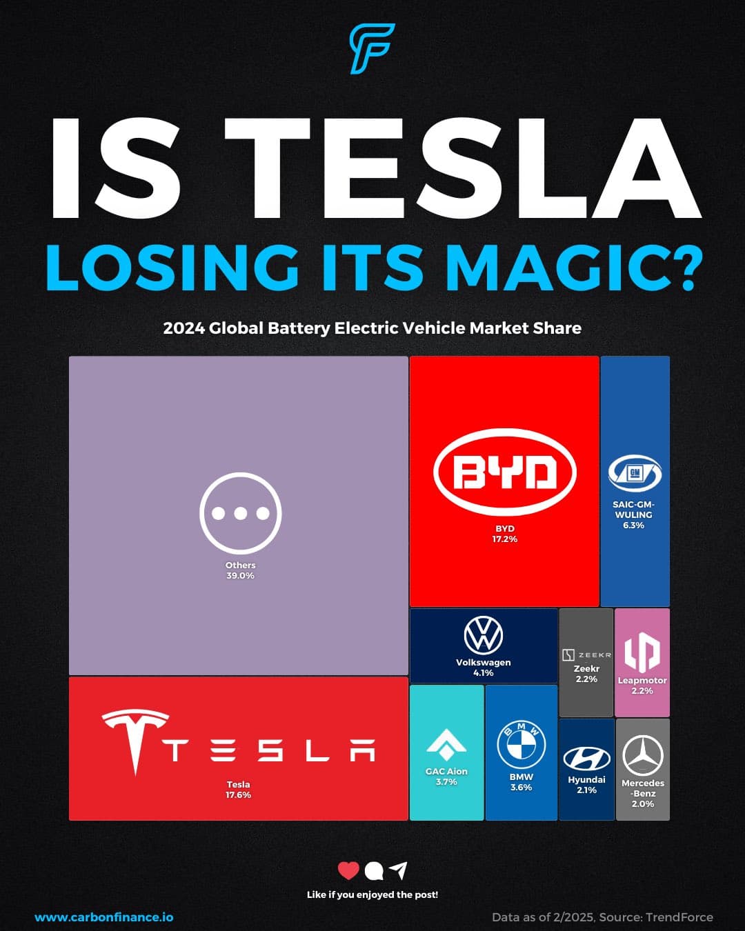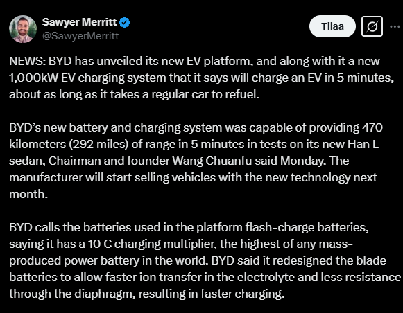 BYD raportoi 777 eli 107 miljardin dollarin vuotuisen liikevaihdon vuodelle 2024 ohittaen Teslan. BYD kasvaa nopeasti sähköautojen ja hybridien markkinoilla rikkoenjatkuvasti ulkomaisten merkkien dominanssia. Jutussa myös muistutetaan vielä siitä, miten yhtiö kehitti juuri uuden akun, joka mahdollistaa erittäin nopean latauksen.