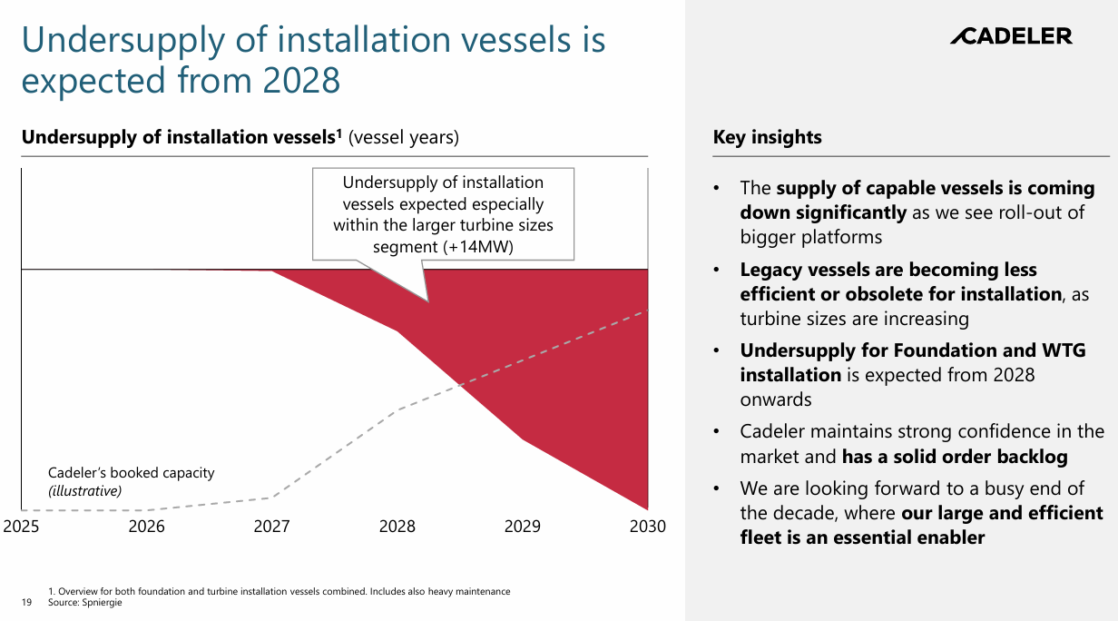 Tuo yhtiön sivuilta, mutta myös BRS nostanut tämän segmentin tilannetta esille (siis ettei aluksia ole riittävästi - esim BRS Review 2024 s. 134-135). Markkinoille on vain tulossa 13 alusta jotka kykenevät suurimpien tuulivoimaloiden asennukseen ja näistä merkittävä osa on juuri Cadelerilla.
