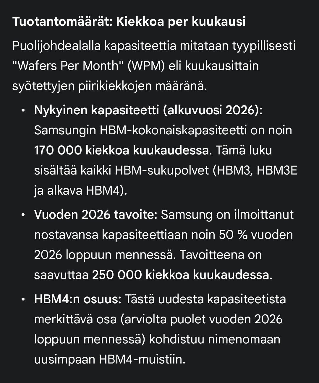 Gemini osaa myös kertoa/hallusinoida, paljonko samsung on suunnitellut tämän vuoden HBM4-tuotannoksi. Vuoden päästä tilinpäätöksessä voisi sitten “rojaltit per wafer” arviota saada ottamalla täältä jakajaksi jonkin arvion, kun tiedetään että kuinka monella reaktorilla fst/samsung painaa kiekkoa ulos.