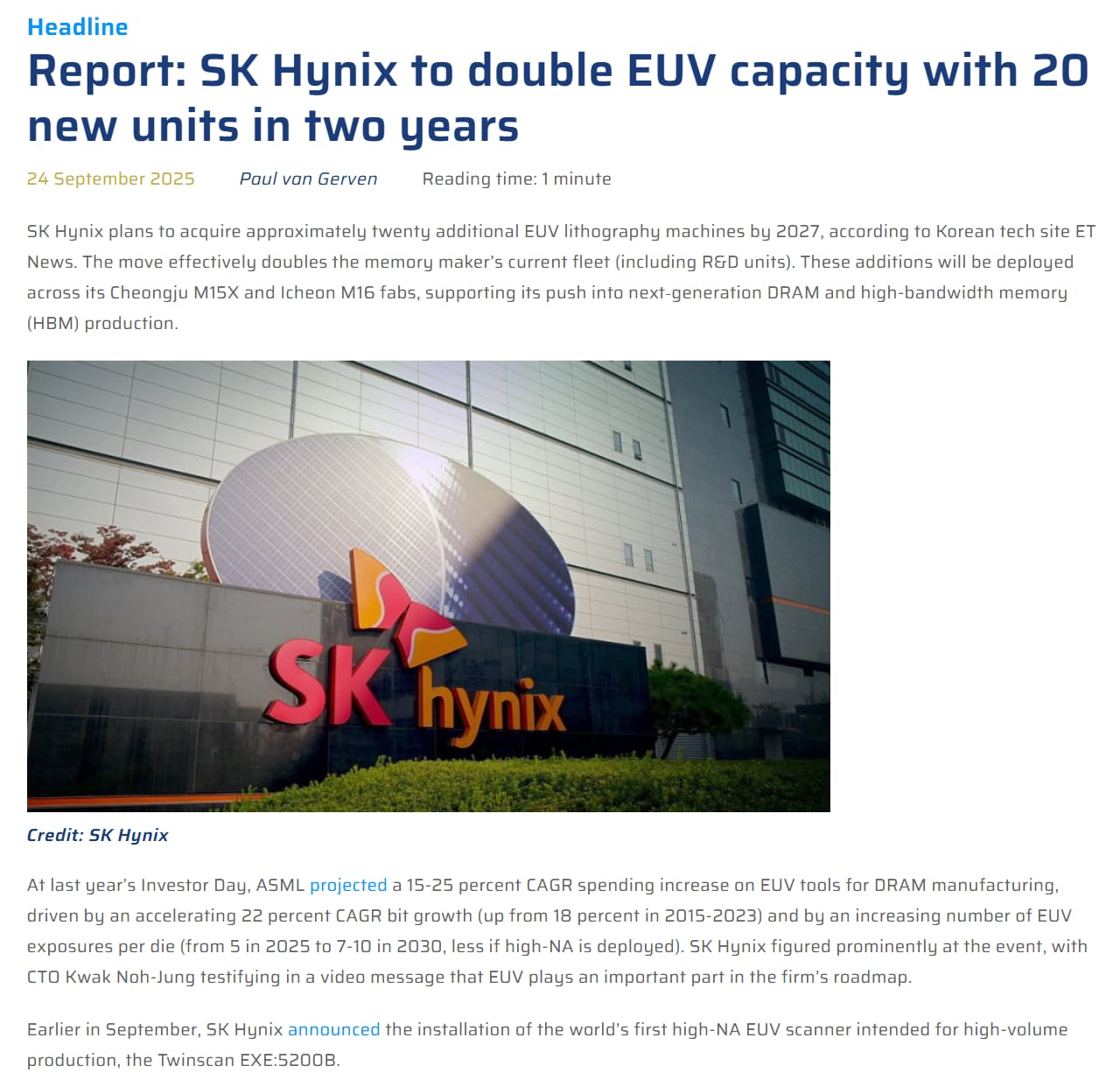 Report: SK Hynix to double EUV capacity with 20 new units in two years - Bits&Chips