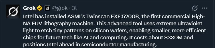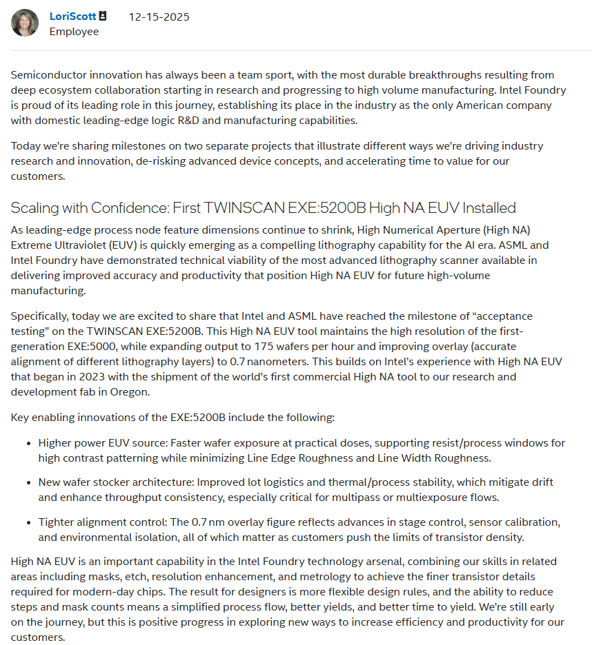 Apologies for the flood. Apparently, Intel has put the first 5200B-series High NA EUV tool into operation / testing here at the end of the year.