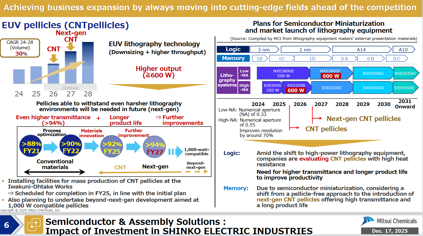 Yesterday, a strategy update presentation came from Canatu’s competitor, Mitsui Chemicals. There’s nothing in these that hasn’t already been covered here, perhaps the biggest observation being the start-up of a new pellicle factory, which will happen in March 2026, with a stated capacity of 5000 pellicles. The competitor heavily promotes in the presentation that they want to become the number one player in the market.