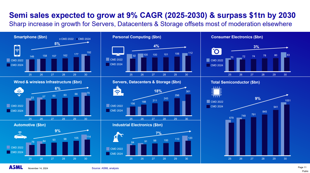 Nostona tuo koko puolijohdemarkkinan ennustettu kehitys vuoteen 2030 asti. Vuoden 2022 pääomamarkkinapäivän arvioista tekoälyliitännäisen markkinan arvioita nostettu reippaasti, kun taas muilla alueilla kehitys on ollut / odotetaan olevan hieman rauhallisempaa.