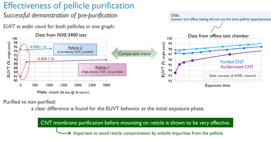 Jos en ihan väärässä ole niin sillä kalvolla joka Canatun pellikkeliin laitetaan toisen toimijan toimesta on suuri merkitys miten pellikkeli kestää käytössä. Mun käsitys on, että CNT itsessään kestää jokin verran käytettävää EUV valonlähdettä, mutta valolähteen tehojen nousujen myötä tarvitaan erillinen pinnoite jota tämä toinen toimittaja tarjoaa. Ja sitä mukaan kun tehot nousevat 1000W niin kalvon ominaisuudet tulevat entistä nopeammin vastaan. Mutta tosiaan, tää on mutuilua.