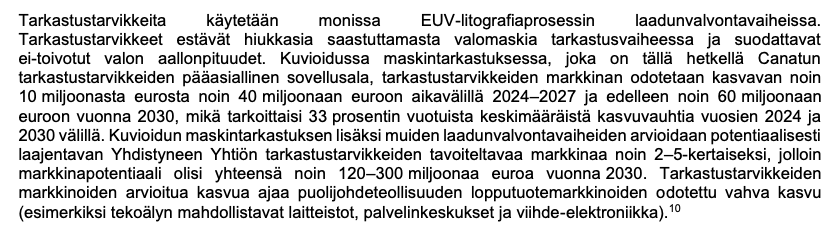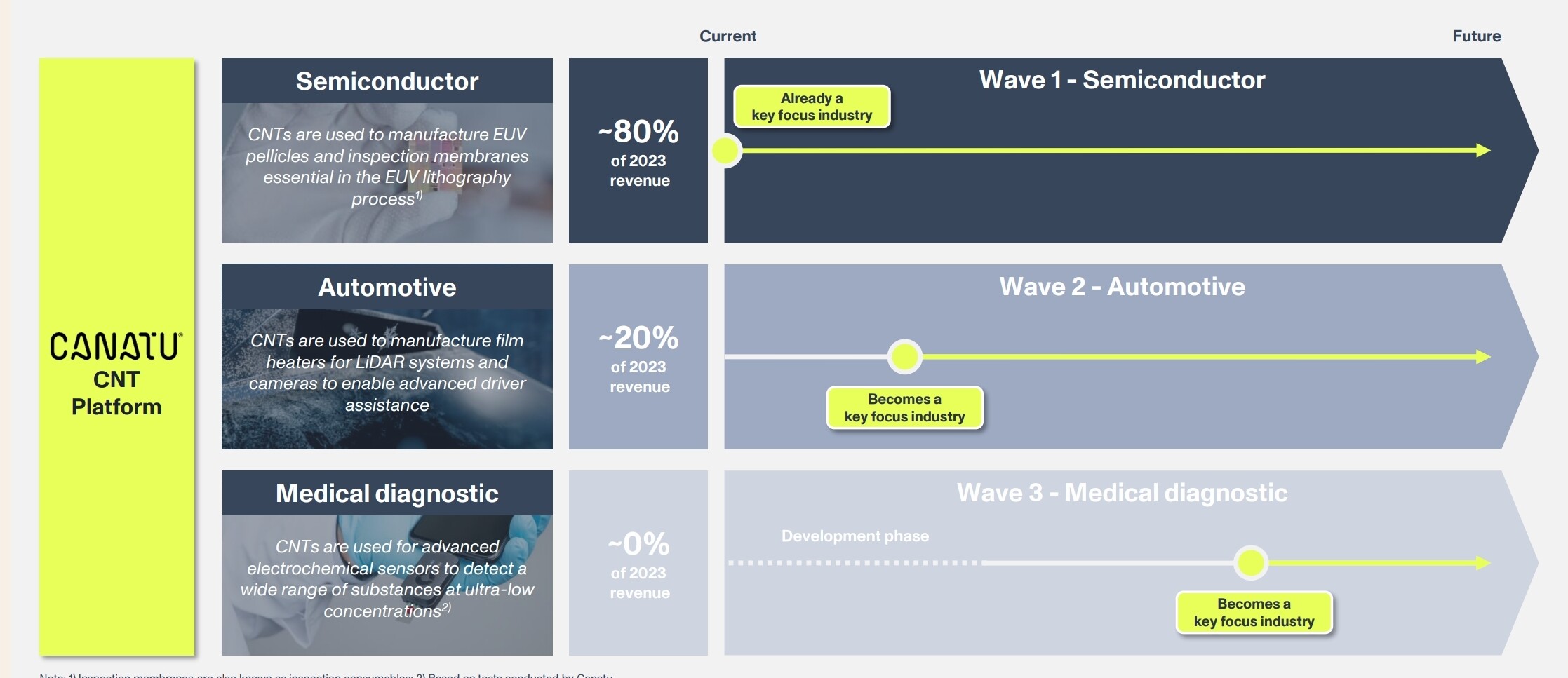 Lisäksi Canatulla on kolme painopistealuetta, jotka ovat puolijohdeteollisuus, autoteollisuus ja diagnostiikka.