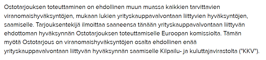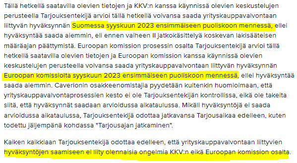 Caverionin ostotarjous etenee. Euroopan komissiolta vihreää valoa. Vielä KKV tosin jäljellä, jossa voi mennä pidempään, kuten täällä pohdiskeltu. 2.10.2023 päättyy tarjousaika.