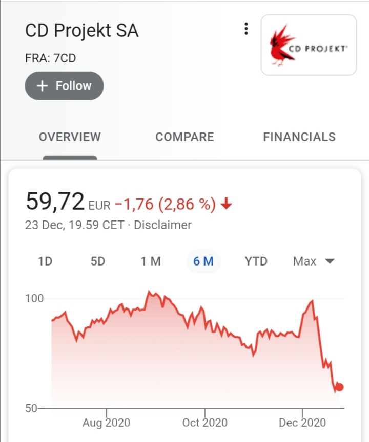 Kurssi on tippunut rajusti, koska Cyberpunk 2077:n konsoliversioissa on ollut suuria ongelmia ja firma on haastettu oikeuteen sekä sijoittajien että kuluttajien huijaamisesta, ja hyvin todennäköisesti häviävät keissin, kun esim. peliennakoijat eivät ole saaneet käyttää itse tehtyä kuvamateriaalia pelistä, vaan ainoastaan CDPR:n itse tekemiä videoita. Ennen julkaisua ovat sanoneet toistuvasti, ettei konsoleilla (erityisesti PS4) ole mitään ongelmia. No, olihan niissä sitten suuria ongelmia kun peli julkaistiin. Vain PC-versio on toiminut pääosin ok, joskin siitäkin puuttuu suuri määrä etukäteen luvattuja tehtäviä ja ominaisuuksia.