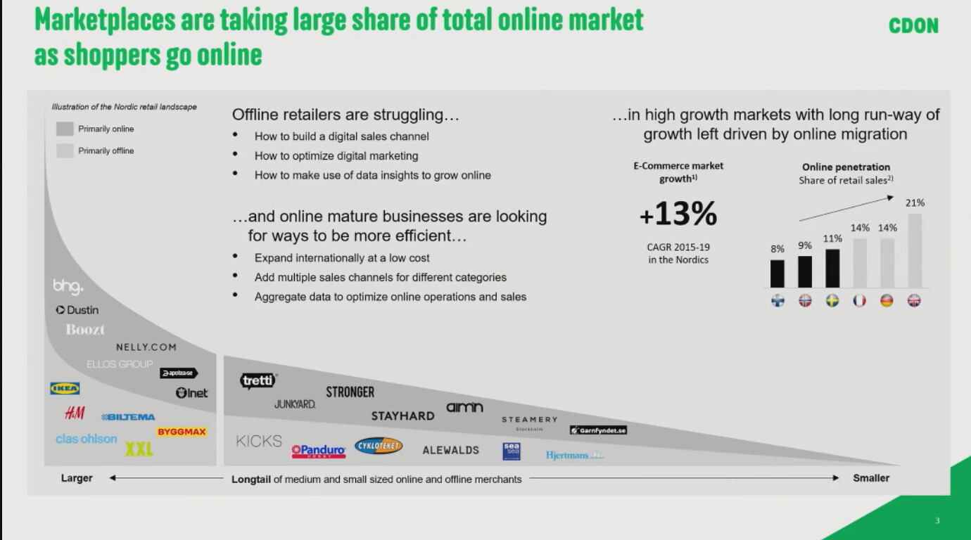 Hyvä avaus! Kuluttajanäkökulmasta CDON:in palvelu on heikentynyt vuosi vuodelta ja tuo mainittu siirtyminen marketplace-bisnekseen ei ole ainakaan komponenttien osalta toiminut, myyjät ovat olleet aika heikkolaatuisia ja kirjaimellisesti ostat sian säkissä (toimituksissa voi kestää useita viikkoja). Lisäksi asiakaspalvelun tavoitettavuus ja toimintanopeus huonontuvat jatkuvasti.