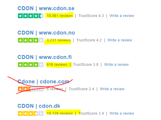 Nimenomaan oma hatara käsitykseni on tuo cdon tunnettavuus jo pitkältä ajalta pohjoismaissa. Noista laittamastani review-määristä voi katsoa vähän missä oletettavasti cdonia suositaan. Suomessa vähemmän.