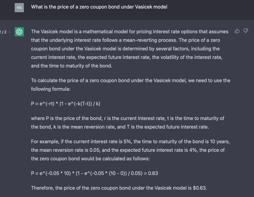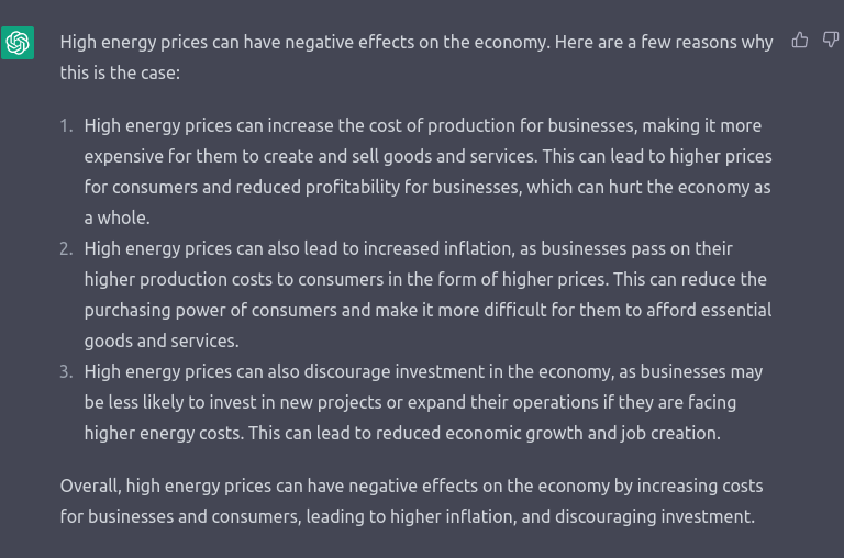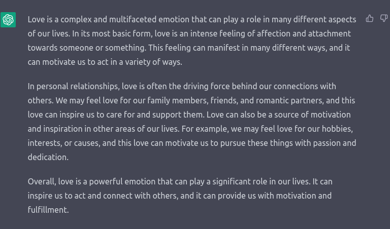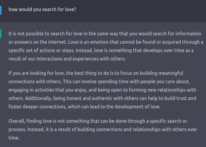 Jeg tog det i brug og talte lidt med det. Jeg bad det først om at skrive et program i Python, der giver det n’te Fibonacci-tal. Det skrev den korteste og mest letforståelige kode og kommenterede, at dette dog ikke er særlig effektivt. Jeg stillede et naturligt opfølgende spørgsmål om, hvorvidt det kunne give nogle mere effektive. Det skrev to andre algoritmer og forklarede dem godt. Jeg spurgte, hvor effektive de egentlig er, og det fortalte om tidskompleksiteterne efter først at have forklaret konceptet på en forståelig måde. Jeg spurgte, om matrix-algoritmens O(log n) er den optimale tidskompleksitet for dette problem. Det svarede, at man i design af algoritmer aldrig rigtig kan vide, hvad der er optimalt, og at man altid bør forsøge at forbedre det. Jeg spurgte, om O(n log n) ikke trods alt er optimalt til f.eks. sortering, og det gav igen et rigtig smart svar, hvor det uddybede forskellige mulige krav til sortering.
