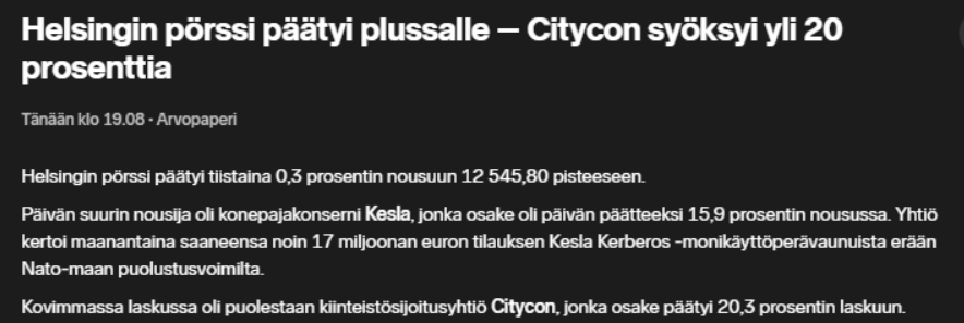 Sikke nogle historier fra Arvopaperi (værdipapir), hvor andres udbytter nævnes, men den største faldende aktie glemmes at nævnes. Hvor kapitalafkastet var større end aktiekursfaldet. Den finske finansjournalistik’s klareste stjerne.