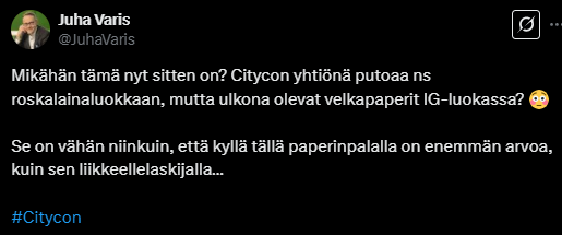 Varis twiittaa, että OP tietää kertoa, että Cityconin credit rating ei ole enää ns Investment Grade (10 ratingia), vaan ns roskalainaa.