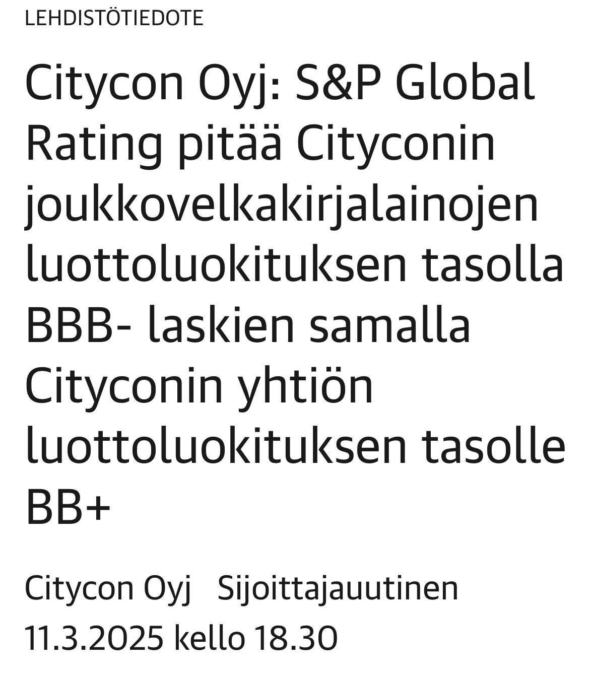 OP kertoo, että S&P pudotti Cityconin kaikki lainat eilen ns roskaluokkaan. Yhtiö ei ole asiasta tiedottanut, mutta eihän tuo niin tärkeää olekaan velkaisellw kiinteistöyhtiölle…