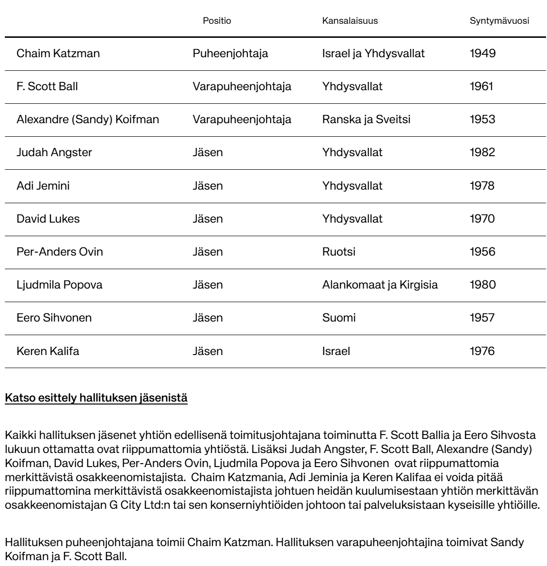 Lisäksi Judah Angster, F. Scott Ball, Alexandre (Sandy) Koifman, David Lukes, Per-Anders Ovin, Ljudmila Popova ja Eero Sihvonen ovat riippumattomia merkittävistä osakkeenomistajista.