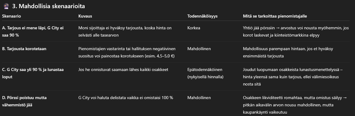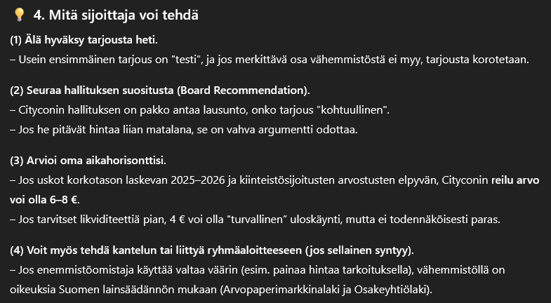 Tässä vaiheessa myös ostotarjouksen tekijän motiivit ovat kaiketi auki – onko esimerkiksi tarkoitus aktiivisesti tavoitella yli lunastusrajan (90%) menevää omistusosuutta (kenties), vai tyytyä ”keskipitkällä” aikavälillä tämän pakollisen ostotarjouksen lopputulokseen tässä vaiheessa – sikäli kun se jää alle 90%:n (esim. 70%). Mikäli alle 90%:n omistusosuus toteutuu, ja yritys jatkaa edelleen pörssilistalla, vähemmistöosakkaan kannalta - erityisesti Cityconin tapauksessa – on varmasti merkittävä riski vähemmistöosakkaan etujen erinäiselle poljennalle pitkässä juoksussa. Tässä skenaariossa olisi hyvä, jos jollain toisella yksittäisellä (aktiivisella, muskeleita omistavalla) omistajalla/yhteenliittymällä olisi ainakin 10%:n osuus vaikkapa vähemmistöosingon vaatimista varten tms (esim. Ilmarinen).