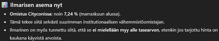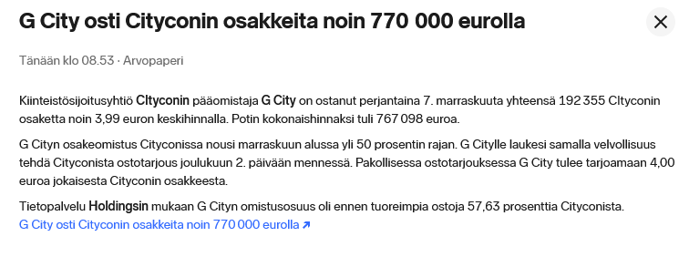 Aika näyttää, mitä tässä Cityconin keississä tulee tapahtumaan, mutta varmasti mielenkiintoinen saaga on tulossa. Päällimmäinen ajatus ostotarjouksen jälkeen, ja vieläkin, on että toivottavasti pienomistajat, sekä vähän suuremmatkin kuten eläkeyhtiöt, eivät helpolla myönny tämän tarjouksen edessä, vaan laittavat ns. aktivistisijoittajan hattua päähän.