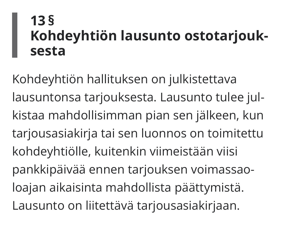 Jeg vil hellere opfordre til at åbne kapitel 11 i værdipapirmarkedsloven og takeover-koden, især i forhold til anbefaling 4 og 5. Især takeover-koden er letlæselig, selvom man ellers ikke plejer at læse juridiske krinkelkroge. Takeover-koden kan findes her: https://www.cgfinland.fi/wp-content/uploads/2023/05/ostotarjouskoodi-2022-fin-2.pdf