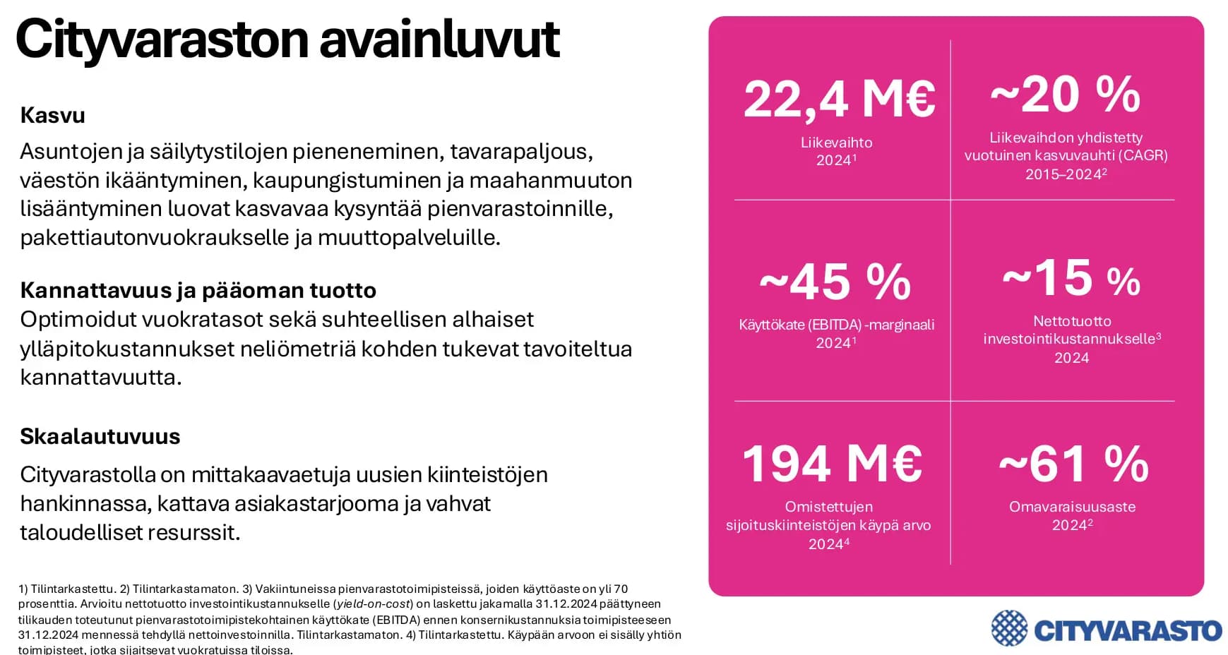 När Cityvarasto nu har gått över från FAS-redovisning till IFRS-bokföring, blir vi av med de fiktiva “Excel-resultaten”. Företaget har förstås också gjort riktiga vinster, eftersom VD:n säger att företaget under 10 år har betalat en årligen stigande utdelning, alltså en sorts utdelningsaristokrat. Den finansieringspott som kommer med noteringen är avsedd att användas för investeringar, uppenbarligen främst för företagsförvärv, så den stigande trenden för utdelningsbetalningar kan brytas. Men en liten utdelning kommer förmodligen ändå årligen. Eftersom uthyrningen av lagerlokaler sköts med hyresgästens telefonknappar, finns det också skalbarhet i denna lätta affärsmodell. Om noteringspriset sedan är dyrt, rimligt eller förmånligt är svårare att bedöma. Men lagerbranschen i sig är en stabil bransch som inte påverkas särskilt mycket av ekonomiska upp- eller nedgångar. I städernas nybyggnation har trenden i flera år varit att man bygger mycket sparsamt med förrådsutrymmen i husen, vilket naturligtvis ökar behovet av att hyra externa lagerlokaler. Jag ska försöka få en liten post från emissionen, och senare eventuellt mer från börsen, om priset håller sig på en realistisk nivå. När bastuföretaget Harvia noterades, ansågs noteringspriset på cirka 5 euro i vissa diskussioner vara “överprissatt” och dyrt. Sedan dess, inom ett par år, var företagets kurs uppe i cirka 50 euro, så visst händer det att aktiekurser rör sig uppåt även i så kallade tråkiga branscher. Tiden får utvisa hur det går för Cityvarasto.