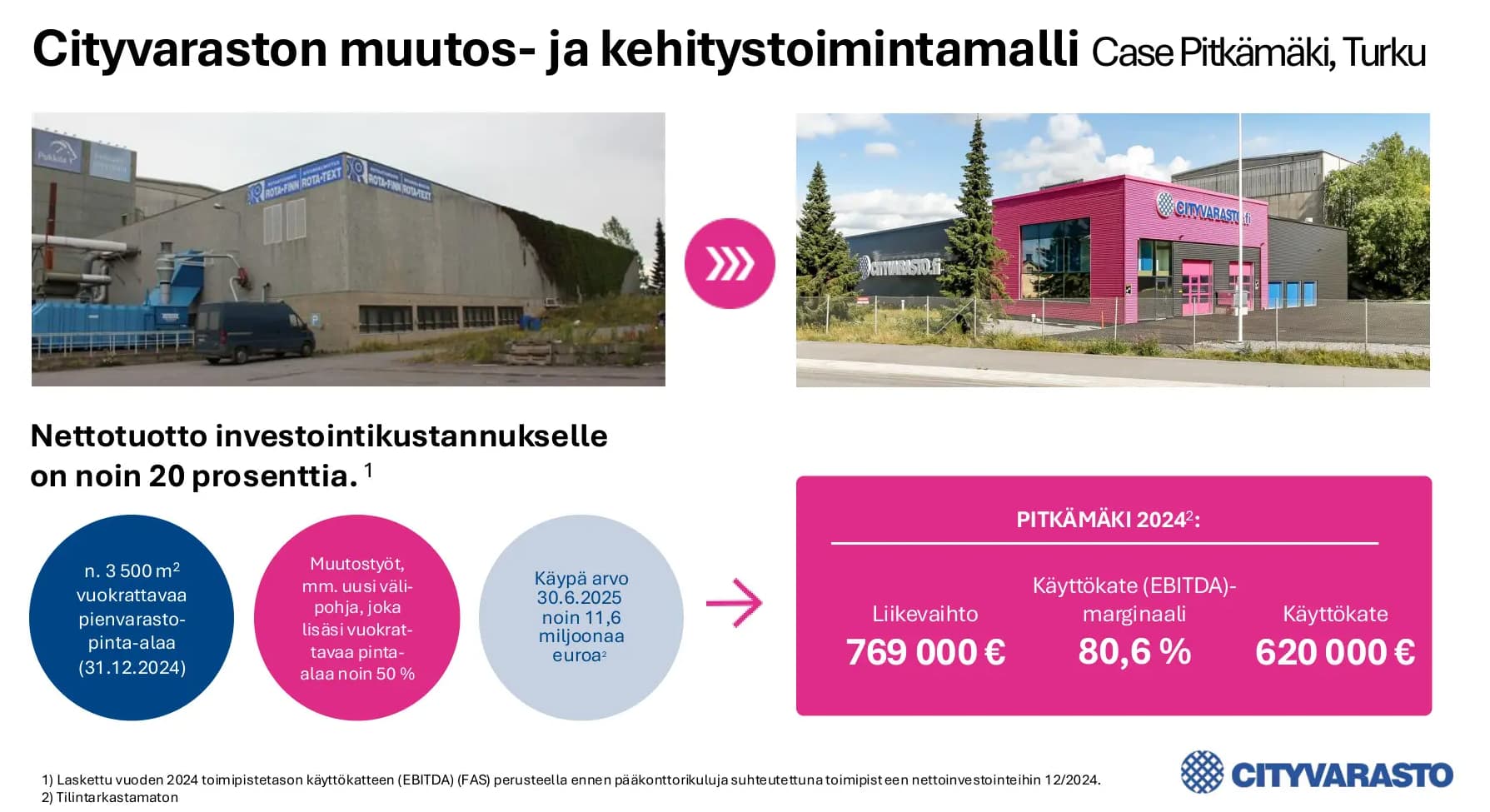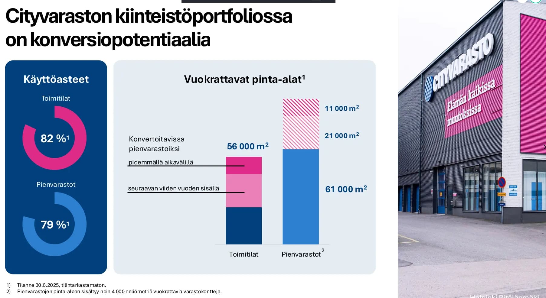 På minussidan med aktieemissionen finns de enorma värdeökningarna i balansräkningen och det höga noteringspriset. Om priset hade varit 9,80 e per aktie, skulle det vara lättare att motivera deltagande i emissionen för sig själv. Å andra sidan är det nuvarande noteringspriset t.ex. OK för Odin Kiinteistö-fonden som ankarinvesterare. Om detta säljs vidare till en kapitalförvaltare om 5 år och företaget då är 50% större än nu i omsättning, finns det också utrymme för uppgång i aktiekursen. Jag kan inte säga om jag kommer att delta, man kan mata in olika gissningar om framtiden i Excel och motivera både ja- och nej-svar. Om det kommer hype på fastighetsmarknaden igen under de närmaste åren, kommer det sannolikt också att synas i Cityvarastos aktiekurs, liksom i Hoivatilo förr i tiden.