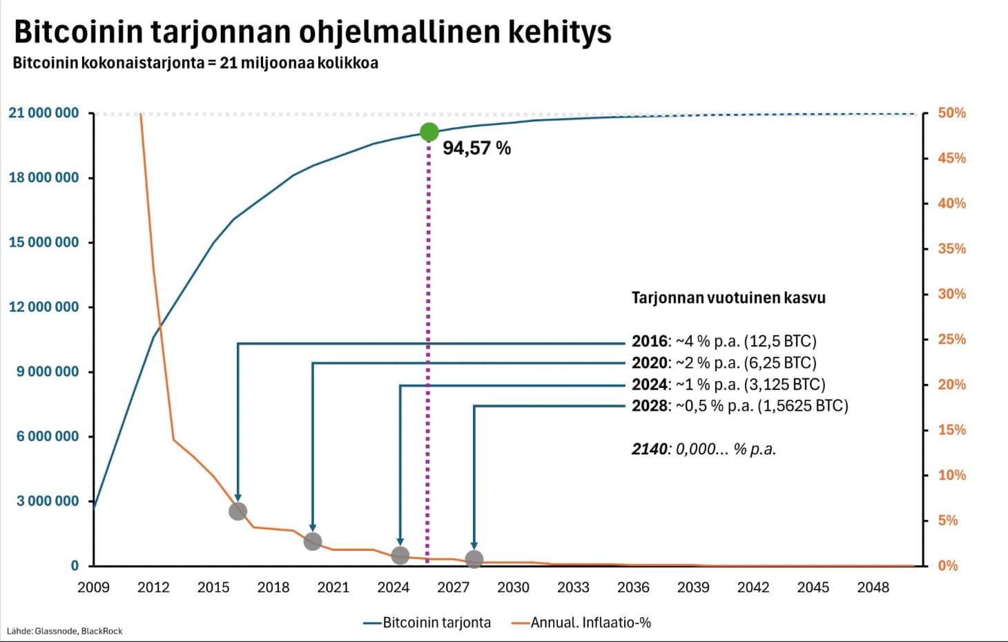 Käytännössä saisit siis noin 20 000–30 000 € lainaa yhtä bitcoinia vastaan, jos olet valmis ottamaan likvidointiriskin ja hyväksyt kryptopalvelun ehdot.”