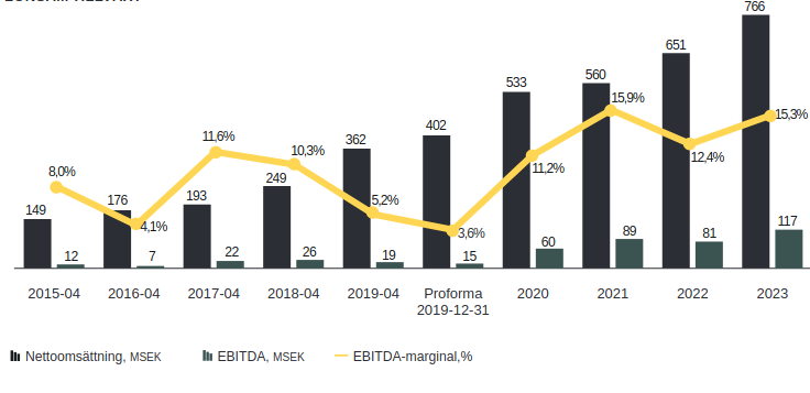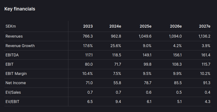 Yritysostostrategia on toistaiseksi ollut oikein kannattava (RedEyen 2024 ennusteissa ROIC on 24 %). Viimeisin yritysosto on tehty tammikuussa 2023. Ruotsissa listaamattoman sektorin arvostustasot eivät vielä ole seuranneet listattua sektoria. Tänä vuonna hyviä kohteita voisi taas olla enemmän tarjolla. Positiivista mielestäni on, että yhtiön kokoluokassa se voi vielä ostaa melko pieniä niche-toimijoita, mutta silti näiden vaikutus voi olla kohtuullisen merkittävä. Oma case rakentuu kuitenkin orgaanisen kehityksen ympärille ja arvostustasojen nousuun.