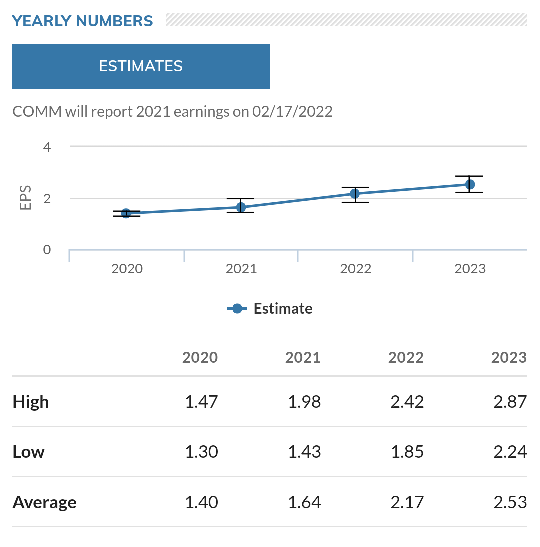 CommScope Holding Company, Inc. is a provider of infrastructure solutions for communication and entertainment networks. The Company operates through five segments: Connectivity Solutions (Connectivity), Mobility Solutions (Mobility), Customer Premises Equipment (CPE), Network & Cloud (N&C) and Ruckus Networks (Ruckus). The Connectivity segment provides fiber optic, copper cable and connectivity solutions. The Mobility segment provides the integral building blocks for cellular base station sites and related connectivity. The CPE segment offers broadband and video products. The N&C segment’s product solutions include cable modem termination system, video infrastructure, distribution and transmission equipment, and cloud solutions. The Ruckus segment provides converged wired and wireless local area network (LAN) networks for enterprises and service providers. Through its ARRIS International plc, it provides broadband, video and wireless technology.