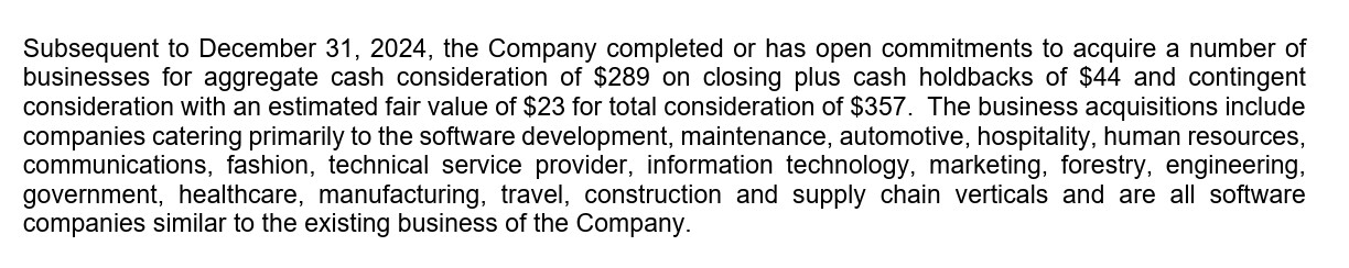 The company is divided into six operating groups. One is even separately listed on the stock exchange: Topicus. Then there is the even more independent Lumine, which was spun out from the Volaris group, also to the stock exchange. For instance, Volaris itself is further divided into several operating groups. Breaking business units into agile, smaller units is clearly a core concept within CSI!