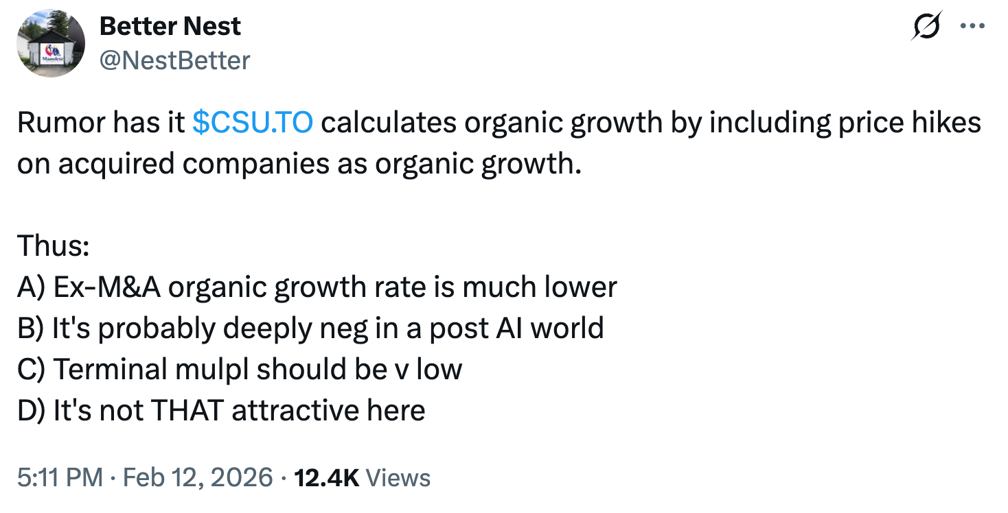 The biggest risks for CSI include its increased size: the core question for an investor is, how long can CSI reinvest its cash flows at excellent returns exceeding the hurdle rate? Copycats abound from Private Equity to “discount Constellations” like Sweden’s Vitec. Personally, I believe there is still enough runway, as the company has first-mover advantage and a good reputation as a permanent home for companies. But the law of large numbers is starting to weigh in. For example, at a 15% growth rate, the company’s revenue would double to 24 billion dollars in 2031. Currently, the global size of the VMS market is estimated to be somewhere in the ballpark of 150 billion dollars. Everyone can consider how large CSI can grow in this VMS land of thousands of small ponds.