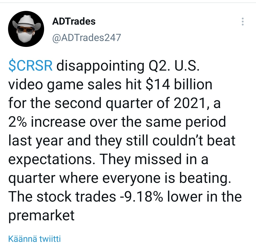 Hups, en huomannut tuota vastaustasi. Kiitos myös päivitetyistä luvuista. Täällä EC litterointi: Corsair Gaming, Inc. (CRSR) CEO Andrew Paul on Q2 2021 Results - Earnings Call Transcript | Seeking Alpha