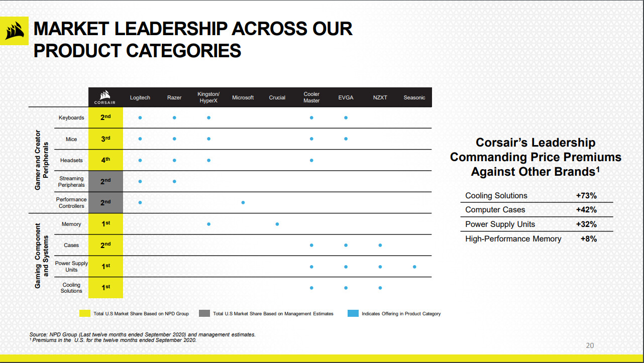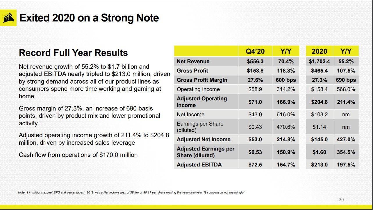 Det var en sådan sump at grave efter værdiansættelsesmultipler, at jeg ikke vil poste dem her. Lad os bare sige, at Corsair var i den billigere ende af de realiserede resultater. Her er dog et stort udråbstegn, når man gennemgår Corsairs årsrapport for 2020: “Nettoomsætningen var $1,7 milliarder, en stigning på 55,2% år-til-år. Nettoomsætningen for segmentet gamer- og creator-periferiudstyr var $539,4 millioner, en stigning på 83,4% år-til-år. Nettoomsætningen for segmentet gamingkomponenter og -systemer var $1.163,0 millioner, en stigning på 44,8% år-til-år.”