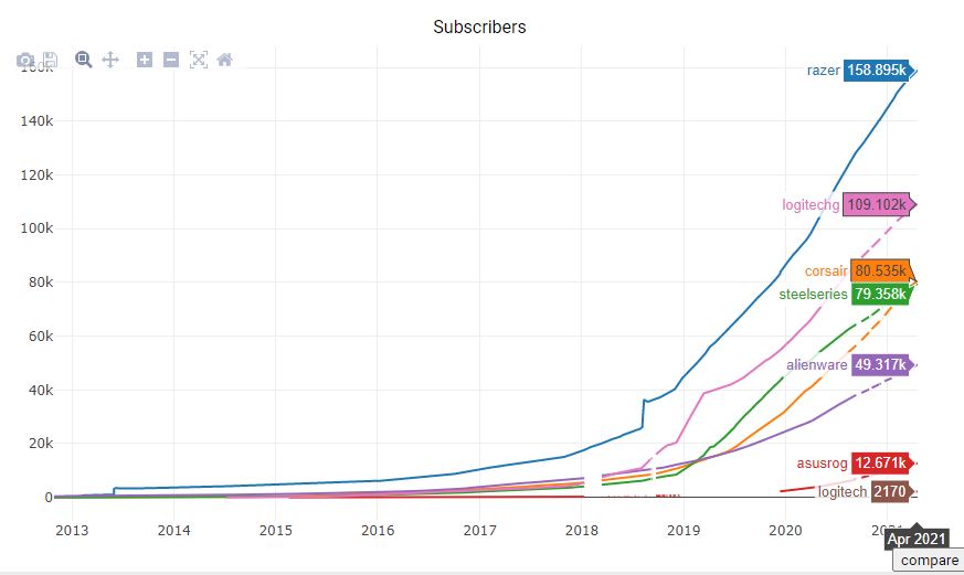 Det er efter min mening lidt udfordrende at finde en direkte sammenligning for Corsair, da konkurrenterne har forskellige fokuspunkter, som så overlapper i varierende grad. Asus er måske mere inden for den hårde hardware (bundkort, GPU’er osv.), Logitech er derimod et renere perifært firma, hvor størstedelen af salget nok er ikke-gaming. Steelseries og Razer sælger så igen nok ikke hukommelse, strømforsyninger el.lign. Razer sælger dog færdige computerpakker.