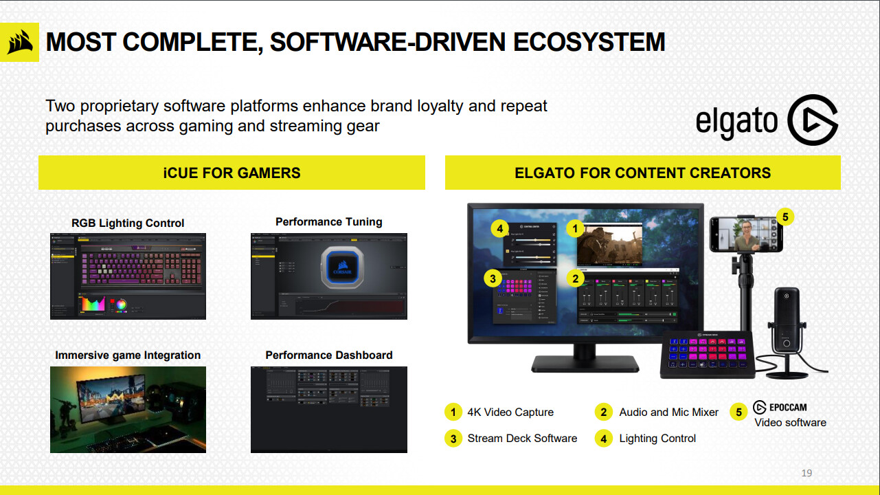 Dette er sandsynligvis et af de magiske ord for investorer: “Software-drevet økosystem”. Når en kunde er blevet indlemmet i det iCue-økosystem, som @jasso nævner, er det nemt at fastholde dem og sælge mere til dem.