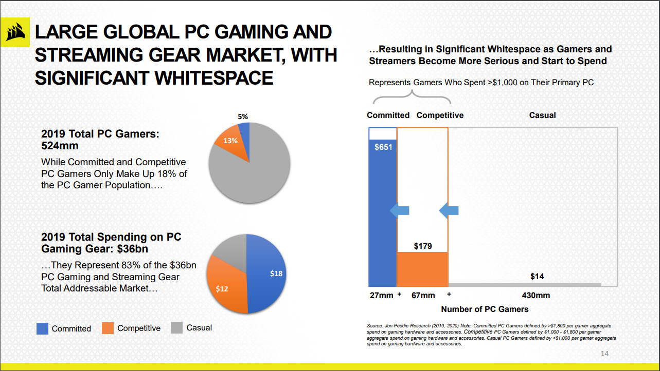 Om kundegruppen: Jeg var overrasket over, at 18% af pc-spillerne skaber 83% af markedet for pc-spilleudstyr. Corsair opfatter, så vidt jeg forstår, denne gruppe som sin primære kundebase, og kunderne omfatter desuden streamere, vloggere, podcastskabere, fjernarbejdere…