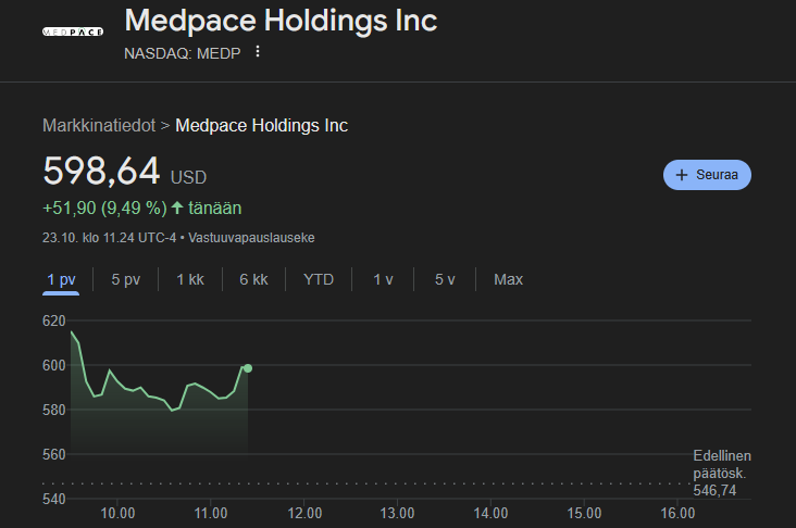 MedPace holdings ilmoitti eilen vuoden 2024 tuloksestaan. EPS reippaasti yli analyytikkoennusteen (3,63usd vs 3,03usd Q4) ja koko vuoden osalta noin 12,6usd. Tulosylityksen kerrotaan johtuneen yhtiön erinomaisesta tehokkuudesta työntekijäresurssien osalta, sekä suotuisista valuuttakurssi- ja korkotuotoista. Työntekijämäärä aikalailla sama, kuin viime kvartaalilla.