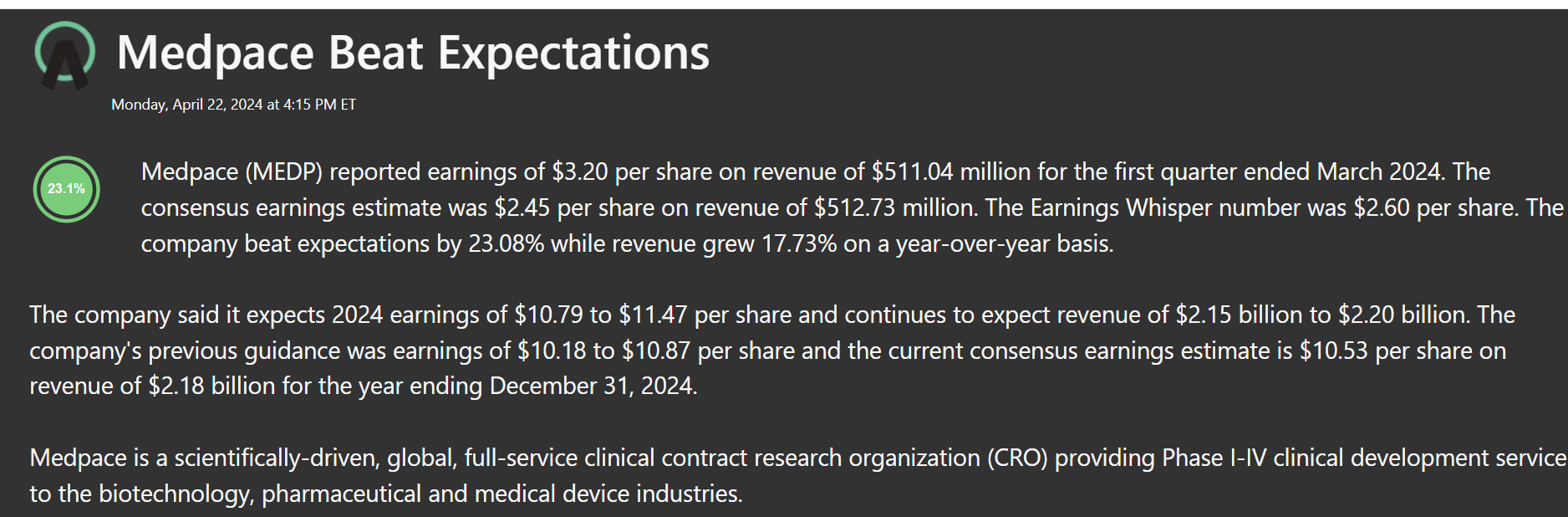 Medpace Holdings, Inc. is a global clinical research organization (CRO) that provides Phase I-IV clinical development services to the biotechnology, pharmaceutical, and medical device industries. It offers services including project management, regulatory affairs, data management, statistical analysis, and medical writing.