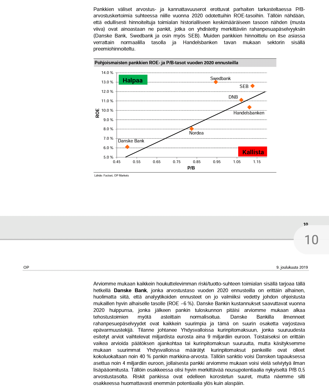 Itse kanssa ostelin danskea ja sikäli, että kurssi laskee takaisin 120DKK tuntumaan, niin varmaan tankkailen lisää. Pläräilin vuosikertomuksen ja conference callin transcriptin läpi ja ainakin siellä näytti siltä, että DB tekee paljon työtä sen eteen, että saa sekä yksityisten että yritysasiakkaiden luottamuksen takaisin ja ainakin äkkiseltään näytti, ettei markkinaosuudet ole juurikaan laskeneet. Myöskään tuloslaskema ei näyttänyt mitenkään erityisen hälyttävältä.Tähän kun yhdistää sen, että mielestäni DB ainakin suomessa ihan fiksusti kilpailee korkeakoulutetuista asiakkaista, joilla todennäköisesti on matalampi riskiprofiili muuhun väestöön verrattuna plus enemmän sijoitusintressejä ja sitä kautta mahdollisesti enemmän tuloja palkkioista jne, sekä matalan arvostuksen niin mielestäni case on ihan hyvällä pohjalla.