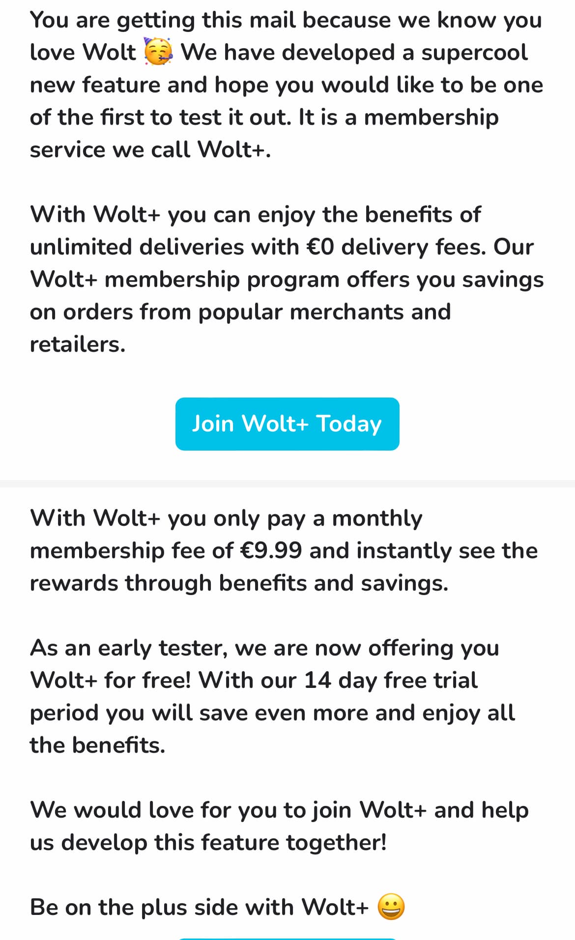 Wolt+ tilauksella (kympin kuussa) saa lähitoimitukset (alle 2,5km, yli 12 e) ilmaiseksi.